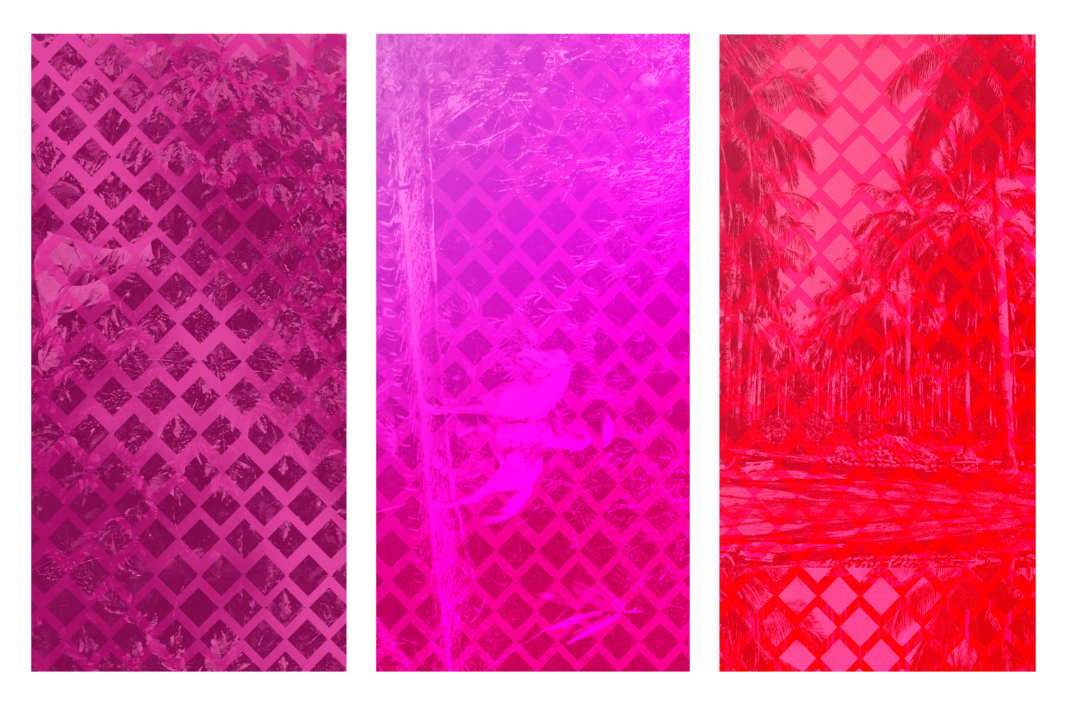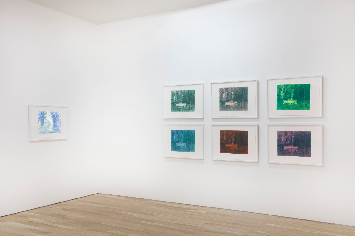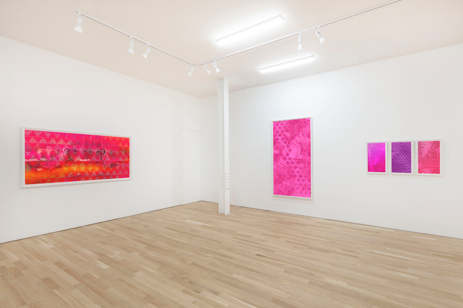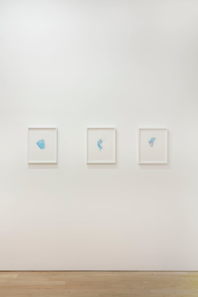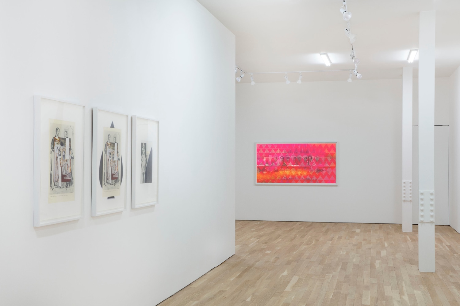 Also included in the exhibition are recent Eminence Grise editions that hint at narratives that are never made fully explicit. Deborah Brown’s Death Maiden, depicting a naked canoeist and her dog paddling on a lake in a forbidding forest, evokes a haunted journey. Editioned in aquatint and chine-collé, each color variant engenders a chromatic series of emotional responses. Using a recently invented digital technology, Daniella Dooling’s assemblages of abandoned surgical masks poses questions about the fate of both the individuals who once wore them and about the anxieties of our pandemic dominated culture. Sara Jimenez’s monumental Radiating from a dark cloud..., is a montage of various photographs from American colonial texts about the Philippines, inspired by staged portraits by American and European photographers of the Filipinx population during the early 1900s.