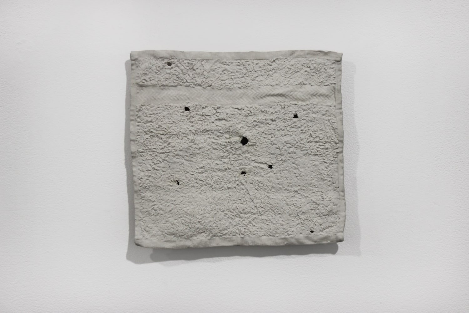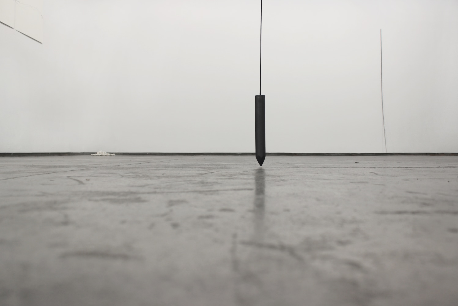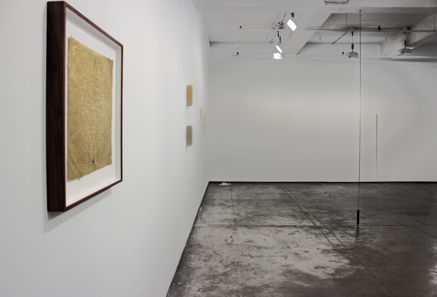 The Suspended Line includes a series of intense tensions and ethereal suspensions: thoughts suspended in submerged books, knitted music sheets, perforated porcelain towels and socks, gold leaf constellations, fatigued newsprint, disjointed bricks: the works in the exhibition challenge the division between two and three dimensions and Newton's law of universal gravitation.