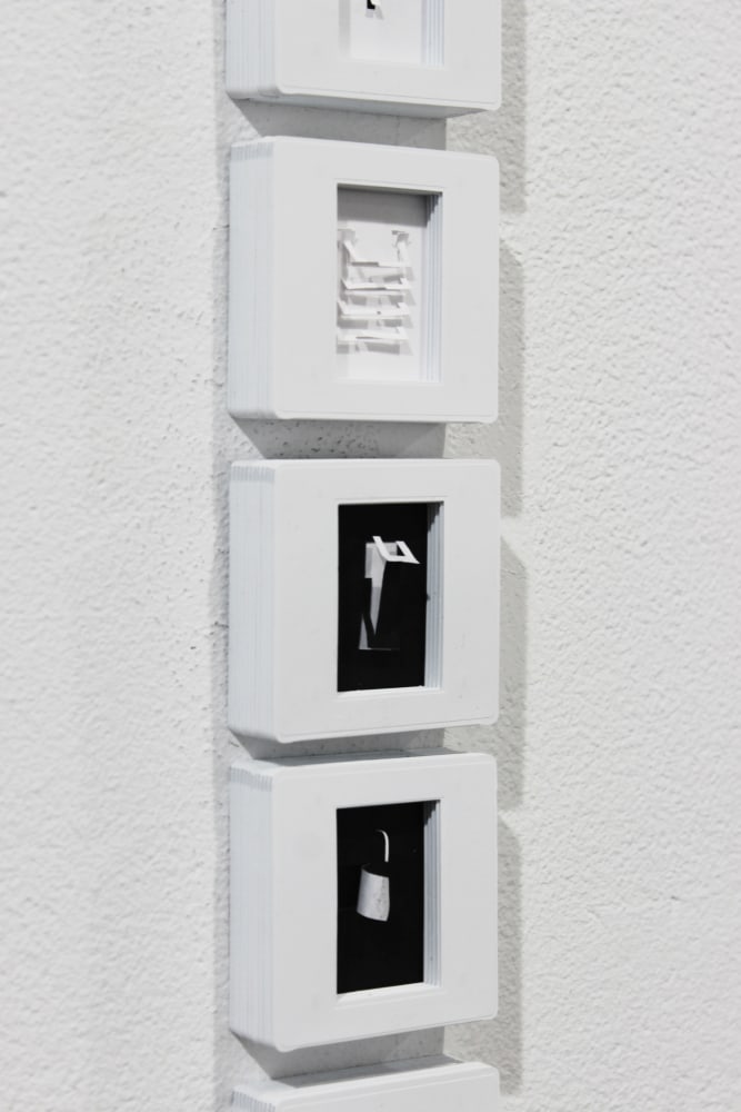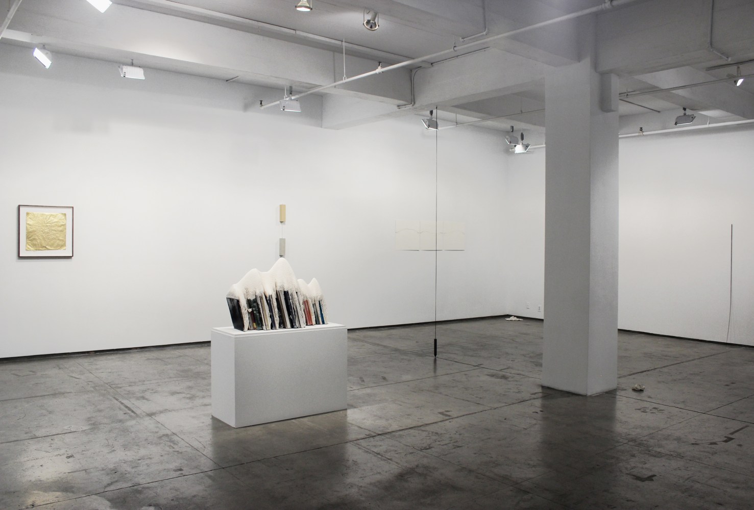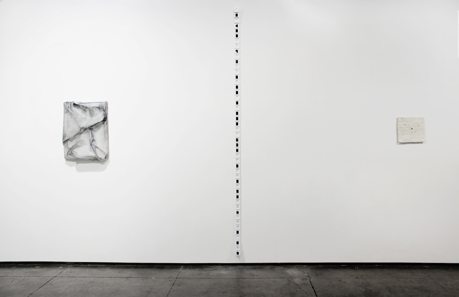 The Suspended Line includes a series of intense tensions and ethereal suspensions: thoughts suspended in submerged books, knitted music sheets, perforated porcelain towels and socks, gold leaf constellations, fatigued newsprint, disjointed bricks: the works in the exhibition challenge the division between two and three dimensions and Newton's law of universal gravitation.