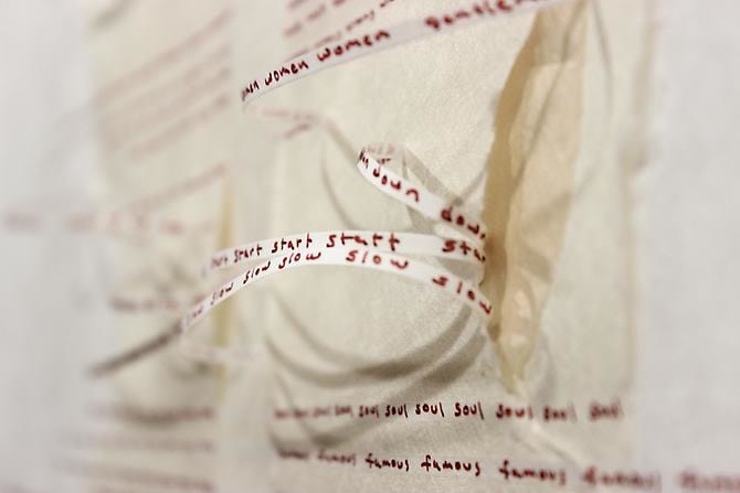 Mapping the land between physical and emotional geography, the artists in the exhibition touch upon the fragile nature of communication, exchange, and relationships. Representations are layered and bonds are forged. Obliteration and reconstruction characterize some of the works. Text is turned into image by means of fragmentation, transliteration or repetition, simultaneously creating and eradicating meaning.