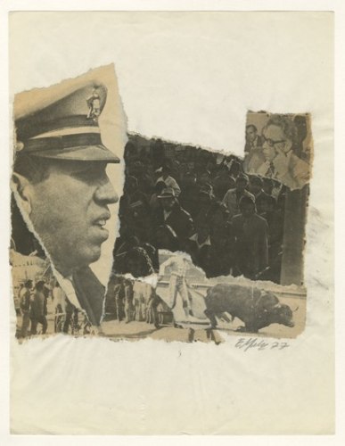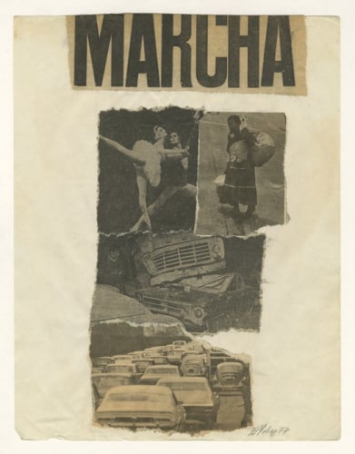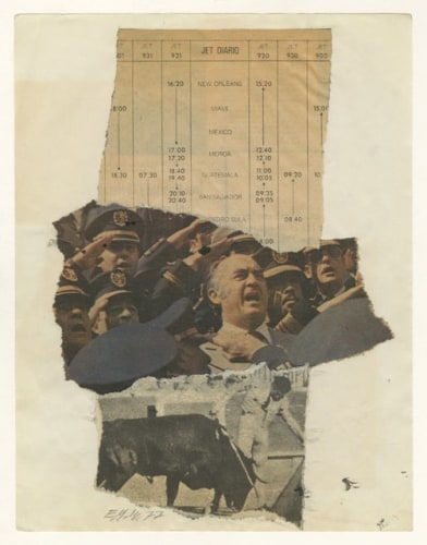 In the 1970s, Ernesto Molina produced a series of collages made of press clippings that he superimposes and juxtaposes. Member of the Suma group, a collective of artists active in Mexico between 1976 and 1982, he uses an urban visual vocabulary borrowed from found objects and other detritus collected from the trash.