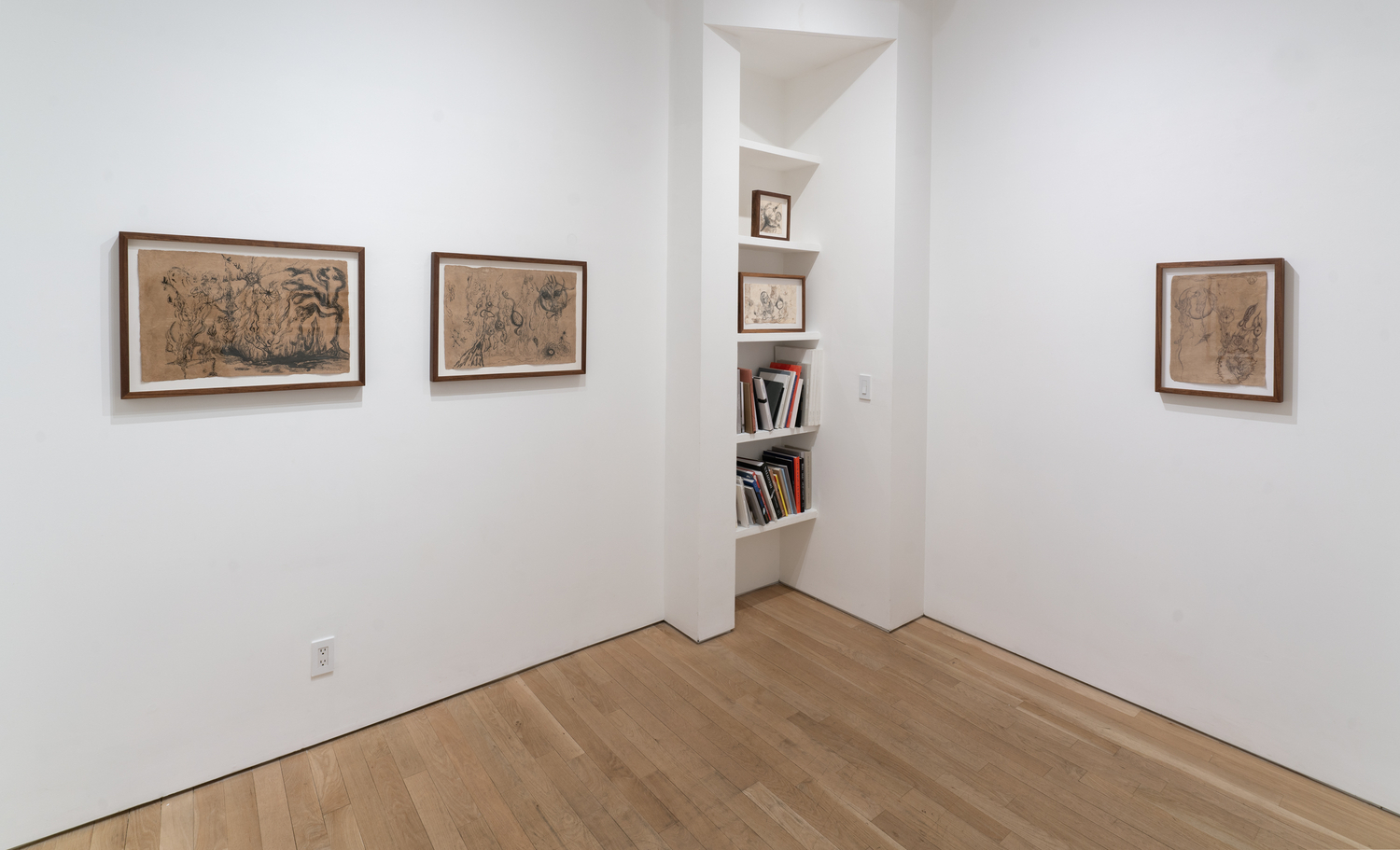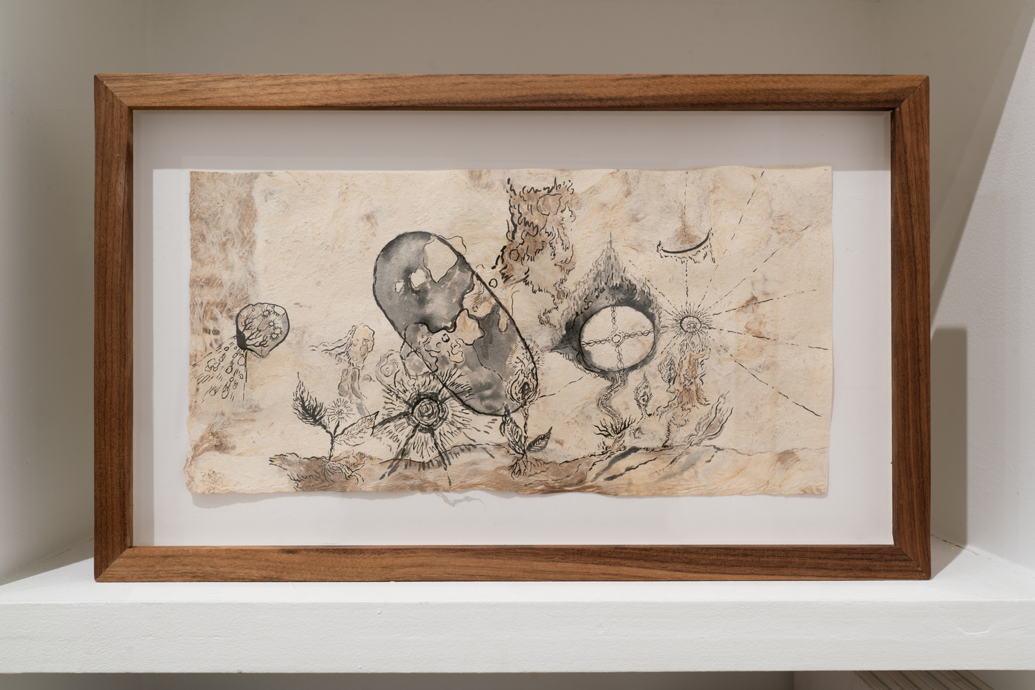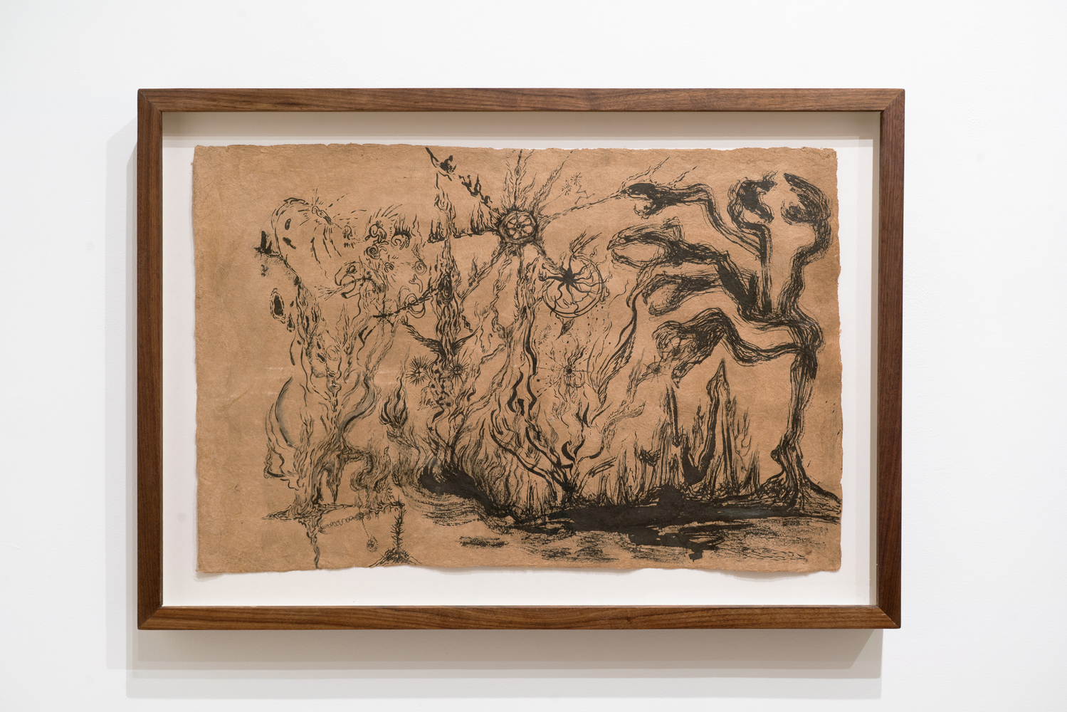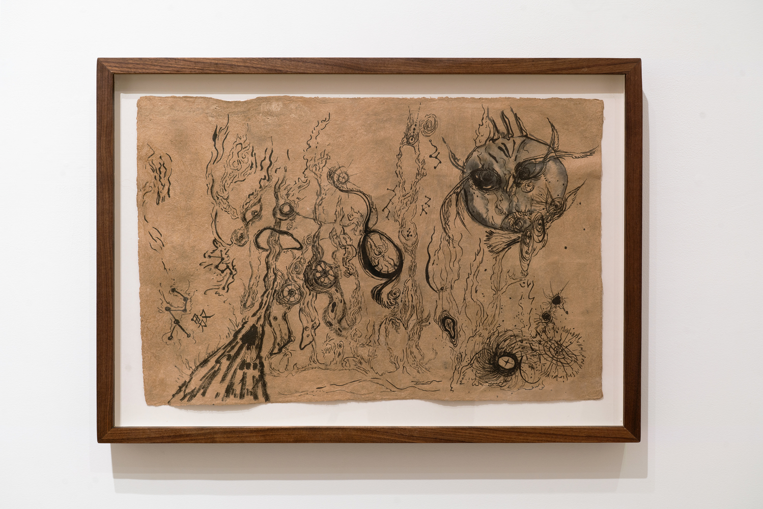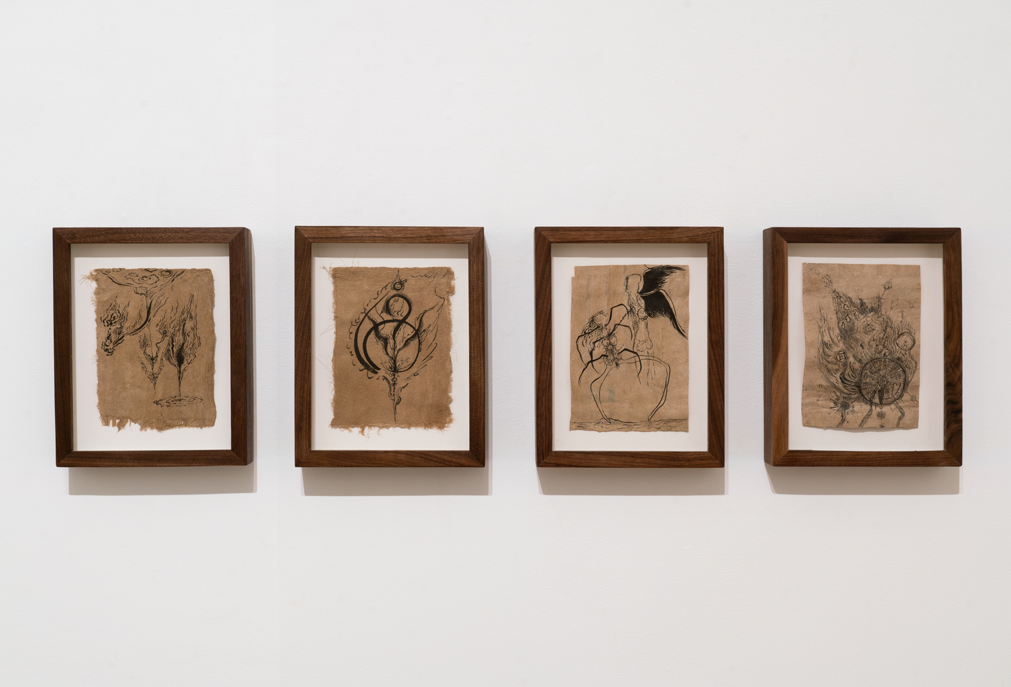This exhibition focuses on ink drawings on amate paper. According to the artist the paper was first chosen for its roughness of texture and the feeling of antiquity it projects. She later discovered that this kind of paper had direct ties to ritual and spiritual texts, a discovery that reawakened her memories of the traditions of her heritage. Li also notes that “the ink too carries a thread back to my grandfather who taught me calligraphy as a child.”
