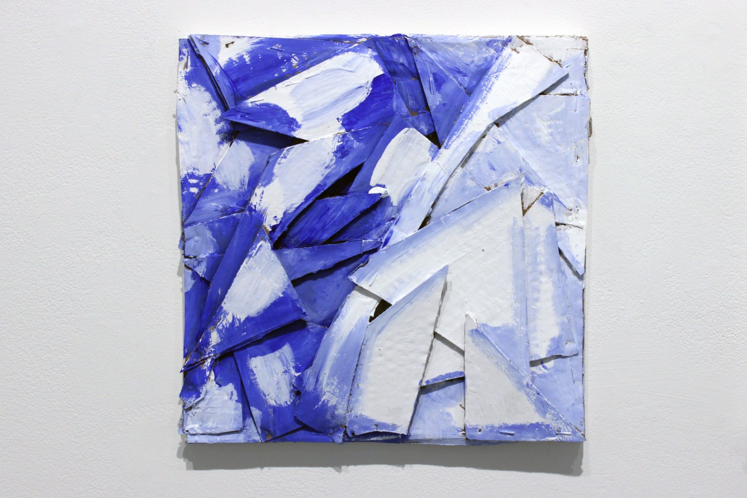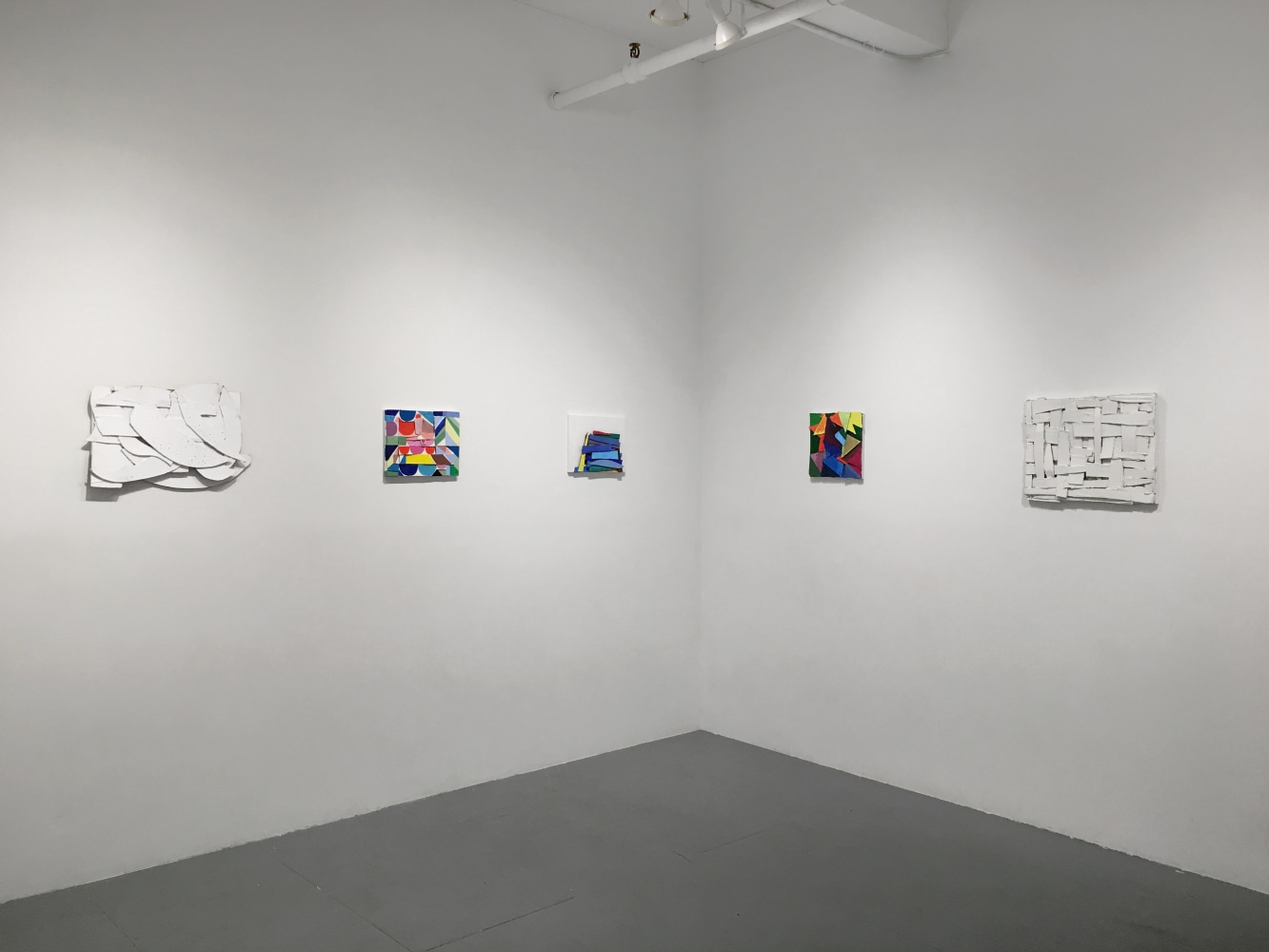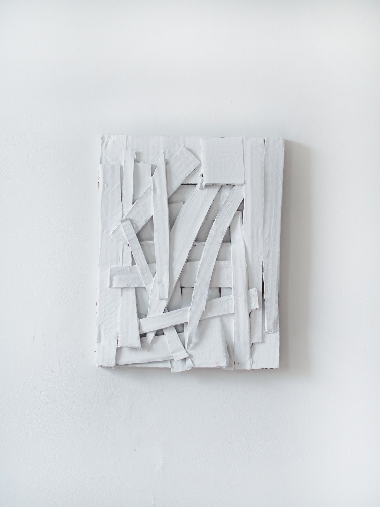 Bovasso’s new work is a sharp departure from her signature high-keyed color palette. The white works are comprised of interwoven shapes, both biomorphic and near-rectilinear, cut from common cardboard and affixed to gessoed canvas. The works are arranged and interwoven into boisterous tense grids, in which each shape seems to elbow the next for dominance on stage. They perform for the viewer, but more importantly test their mettle against one another. Though these compositions can appear to be quickly and aggressively hashed out, the construction is subtle and deft. Behind Bovasso’s incisive manipulation of space is a blend of historical consideration and impatient bravado. Bovasso’s act of bold, fitful cancellation can’t dampen the compositional acuity or intensity. Her move is direct, tough as nails, and hilarious. Bovasso is a badass and we are smitten.