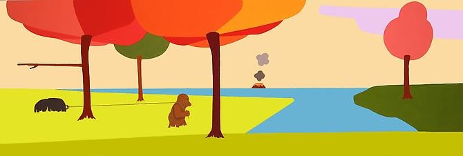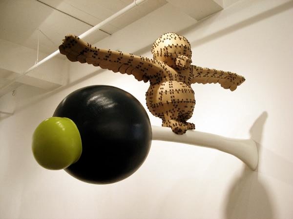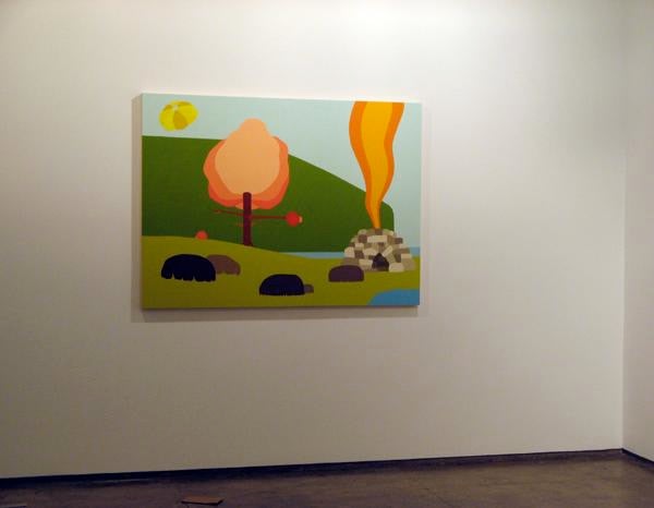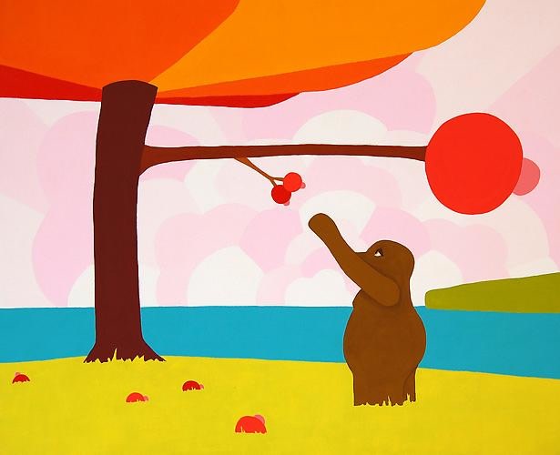 Reminiscent of early video games and children cartoons, Adam Ogilvie’s universe is populated by strange hybrid creatures set against brightly colored backgrounds. The dreamlike imagery, the unnatural light and colors with figures and objects seemingly frozen in time also bring to mind the world of Metaphysical painting and its deceptive simplicity. Caught in unlikely situations, the characters and their environments are stripped of specific narrative contexts, thus offering many possible interpretations. Characters often reappear, though in each scenario their roles become more complex and defined. Poisoned, Beautiful, Almost Gone, is a large hybrid sculpture engaged in an impossible mission: a bear is pulling the strings of a parachute bigger and obviously much heavier than he is, as he is made of cardboard and the parachute aqua resin. Similar figures leap through the paintings, looking possibly distressed, sometimes wearing a red cape; elsewhere they are shown hooking up a string to objects that look like bombs, or balloons; or they are perched on a branch sticking off the wall.