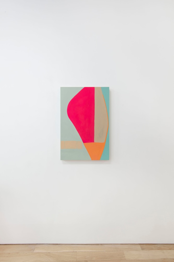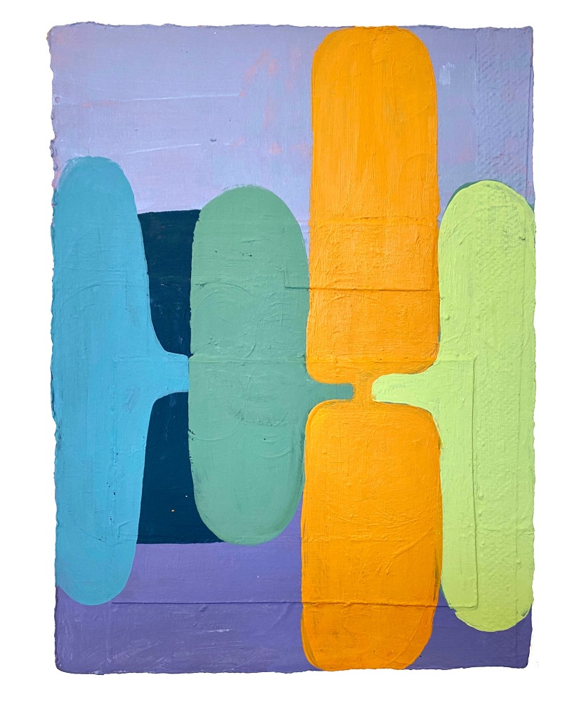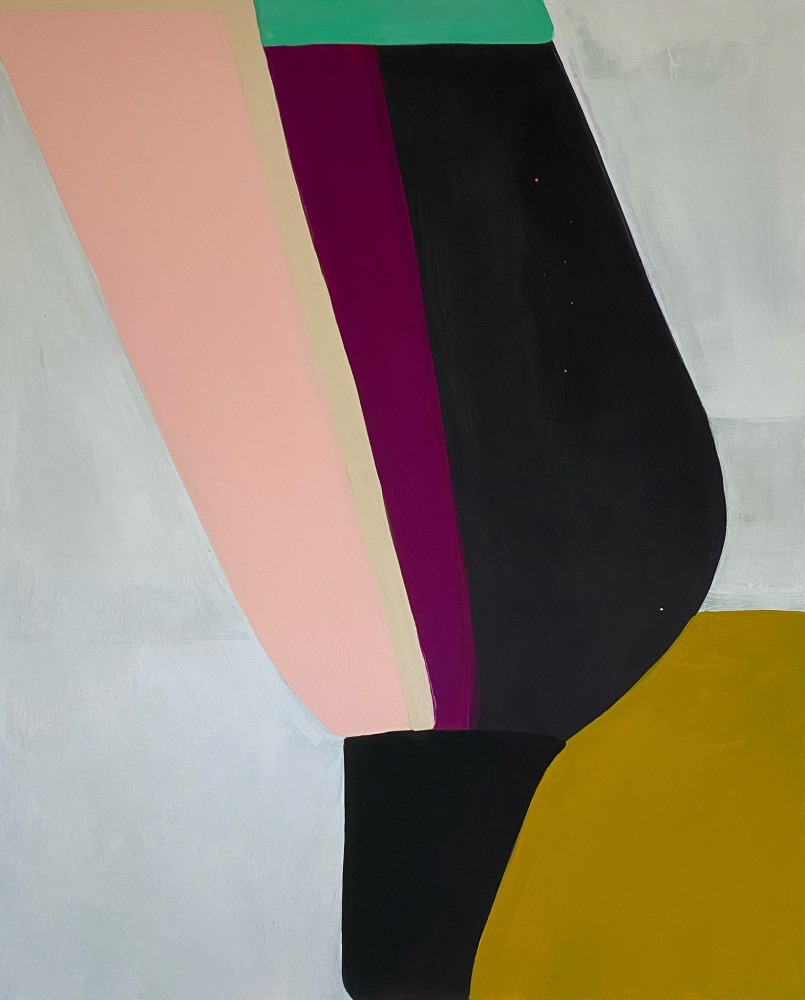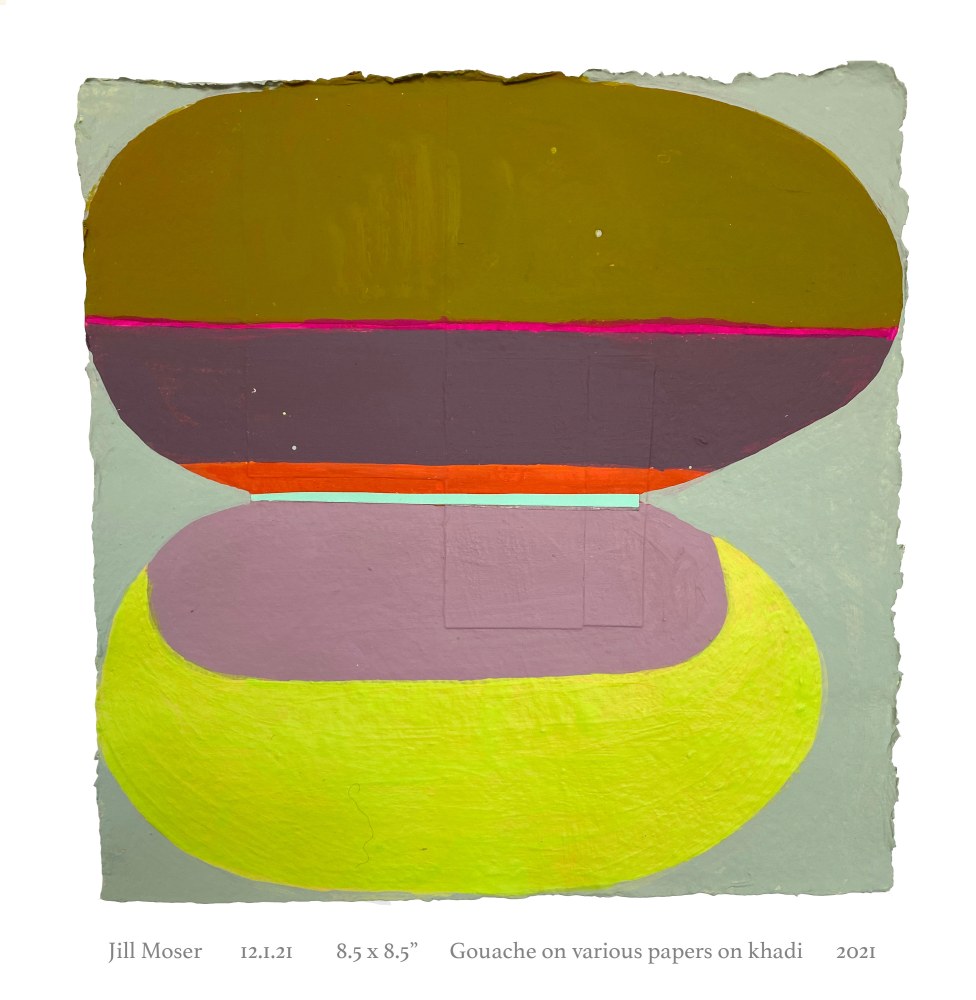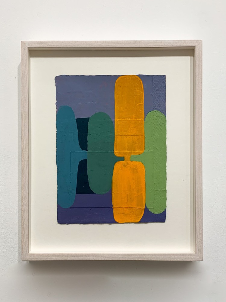 The eleven featured paintings portray complex color relationships and compositions first explored in the series of painted collages Moser began in the Spring of 2020 in response to the anxiety of the pandemic and displacement from her studio: “Made from fragmented, colorful volumes of varying dimensions and degrees of opacity, the paintings’ vivid and compact shapes touch and hug, echo and cancel each other. The chromatic ensembles suggest broken and vessel-like objects, pseudo-geometric topographies, or details of surrogate bodies. As if they were enlarged fragments of even larger forms, the paintings are marked by a sense of monumentality. Their contrasting size and scale and their extended play on part-whole relations makes them similar to imaginary mathematical sets and mereological studies.” (Agnes Berecz)