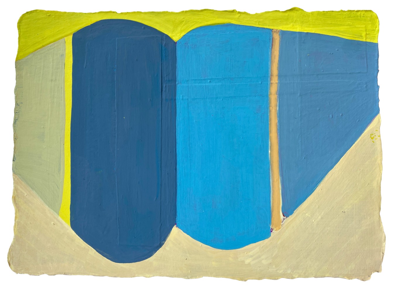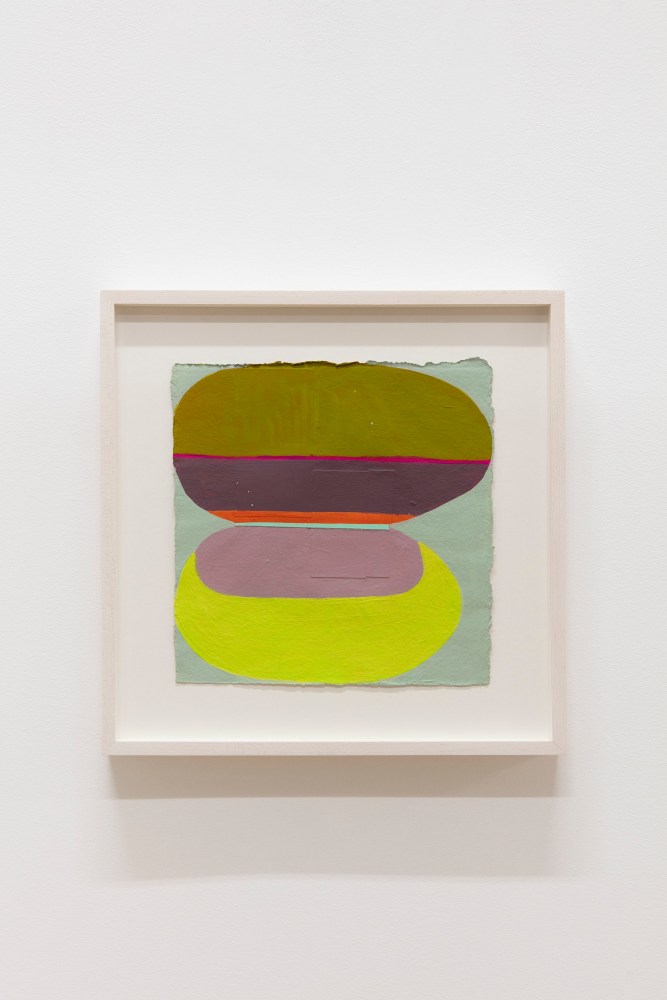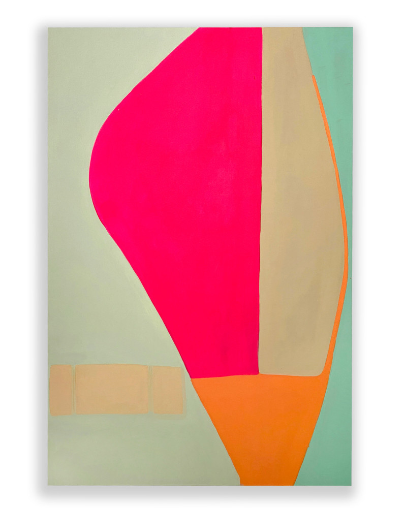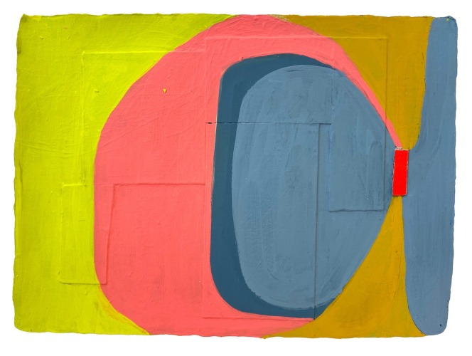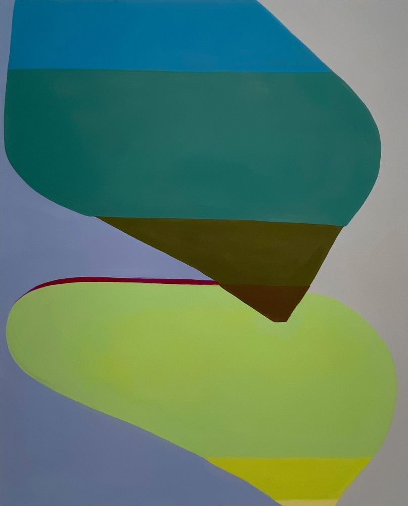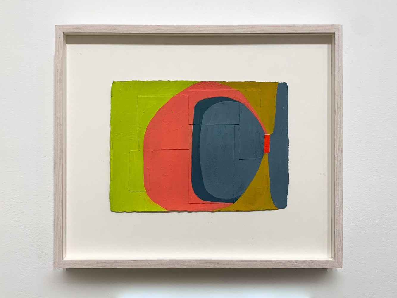 The eleven featured paintings portray complex color relationships and compositions first explored in the series of painted collages Moser began in the Spring of 2020 in response to the anxiety of the pandemic and displacement from her studio: “Made from fragmented, colorful volumes of varying dimensions and degrees of opacity, the paintings’ vivid and compact shapes touch and hug, echo and cancel each other. The chromatic ensembles suggest broken and vessel-like objects, pseudo-geometric topographies, or details of surrogate bodies. As if they were enlarged fragments of even larger forms, the paintings are marked by a sense of monumentality. Their contrasting size and scale and their extended play on part-whole relations makes them similar to imaginary mathematical sets and mereological studies.” (Agnes Berecz)
