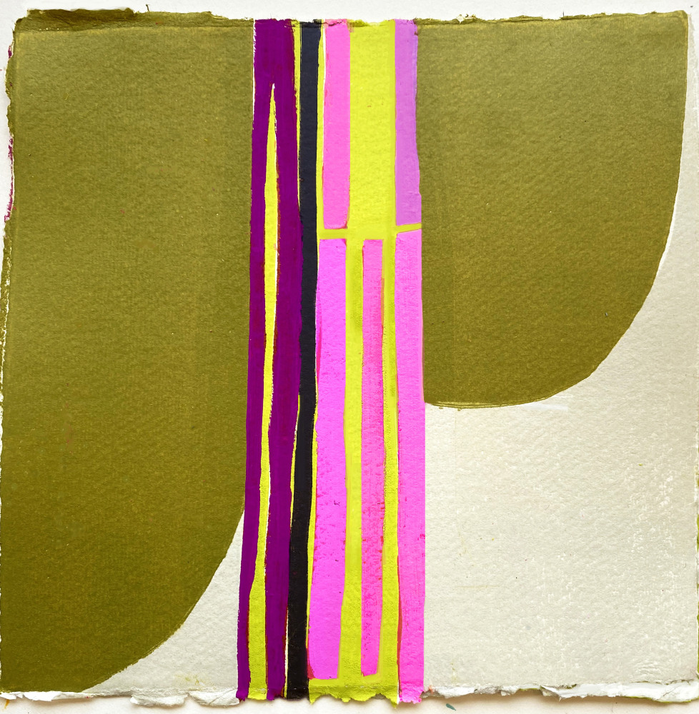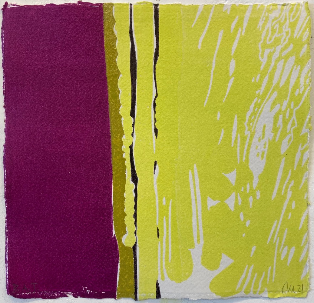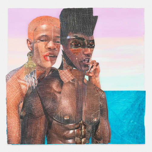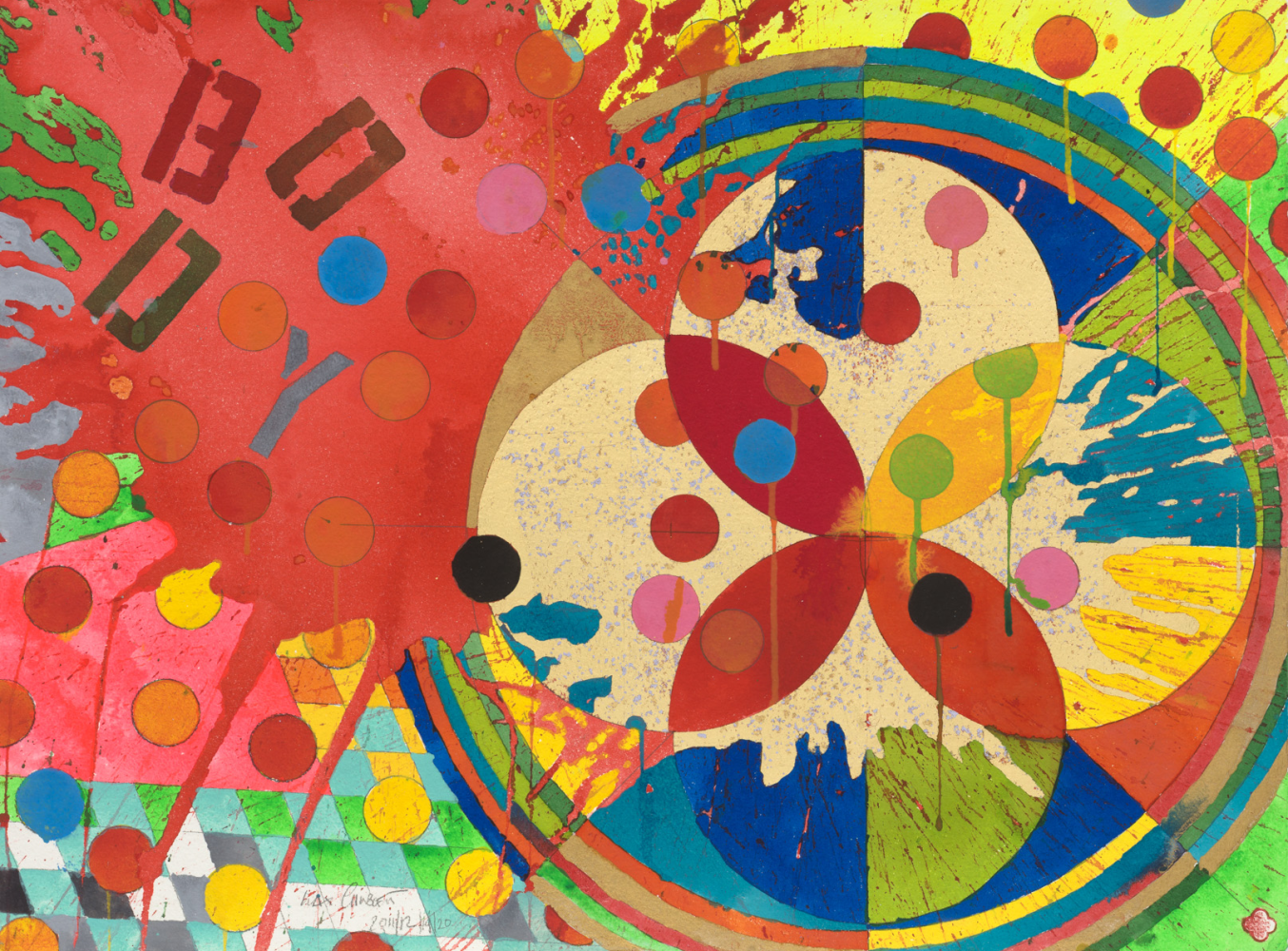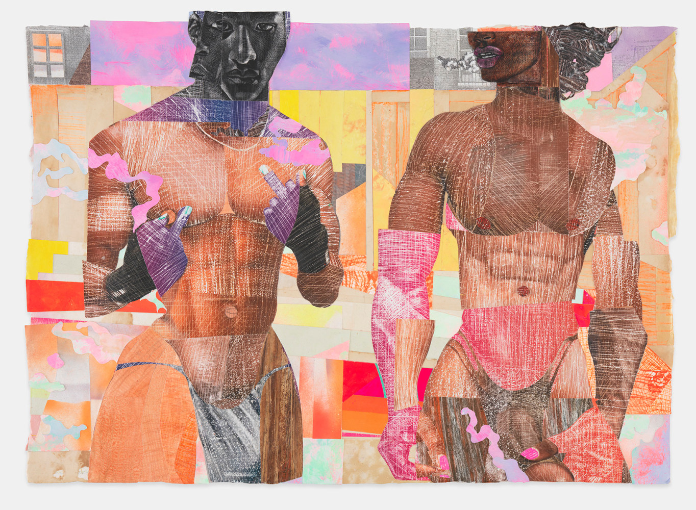 The show provides vivid contrasts and engaging comparisons. Standing as nearly polar opposites are Mahmoud Hamadani’s cool elegant minimalist ink drawings and Vernando Reuben’s richly layered depictions of idealized black queer cruising utopias. Four artists whose works explore distinctive forms of abstraction while sharing a common allegiance to highly colored surfaces are Andrea Belag, Lydia Dona, Max Gimblett and Jill Moser. Belag’s gestural brushstrokes are a counterpoint to Moser’s carefully structured compositions. Dona’s muscular vibrancy simultaneously complements and contrasts with the spiritual joyousness expressed in Gimblett’s watercolors.