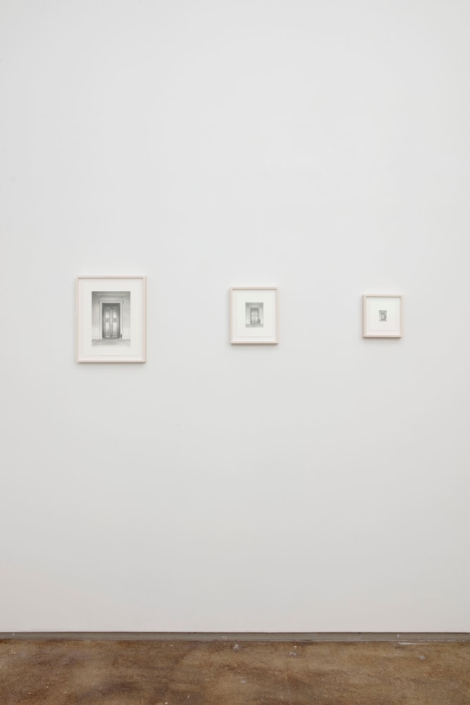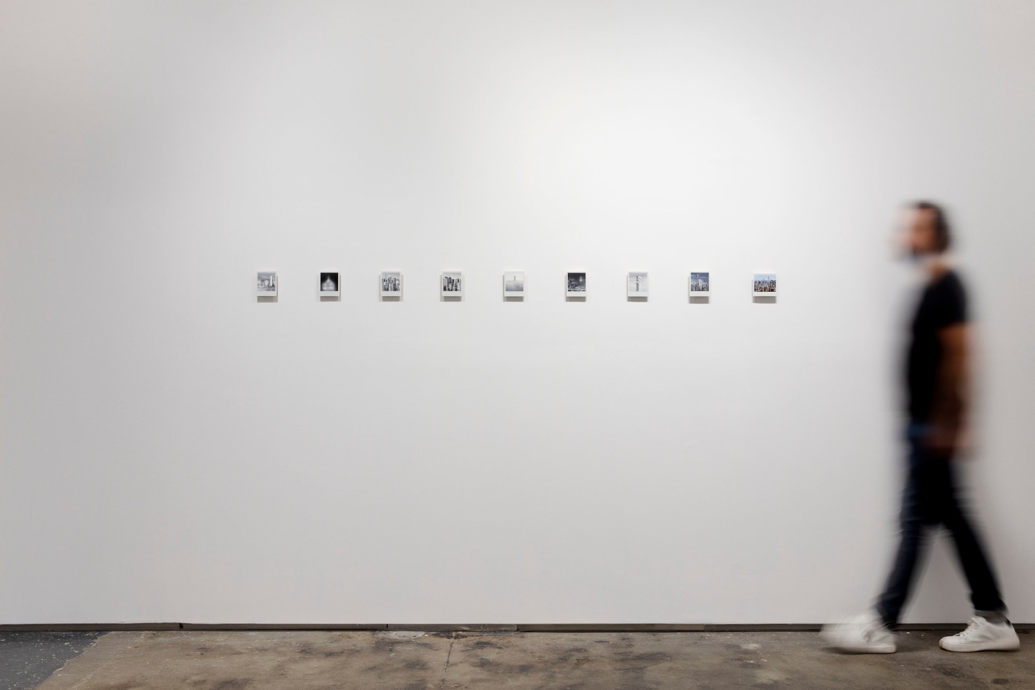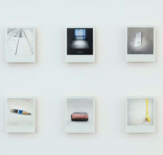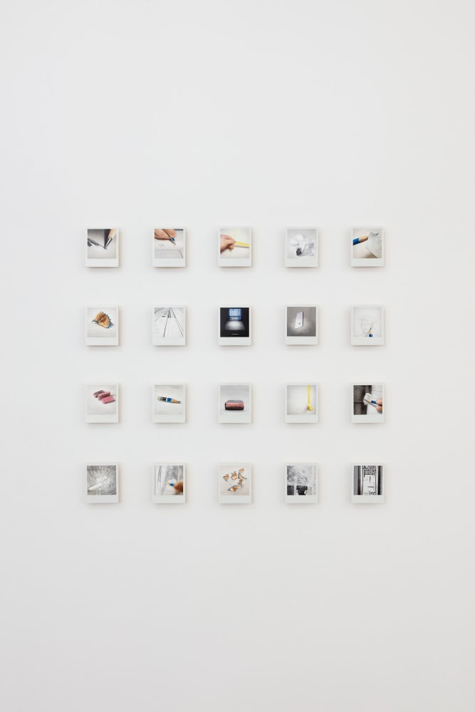 An epilog to the show, Archive Building is a grid of twenty-four oil paintings on Polaroid paper. The title refers again to the National Archive building, as well as to the act of documenting the making of the large pencil drawing They Might be Giants, building an archive of its creation step by step. “Although the documentation of an artwork is usually photographic, I have rendered it in intimate oil paintings by highlighting the tools I used to draw and by showing the process of building up the image. While Polaroid pioneered the instant camera, I have used its film not to register an image via exposure but as a blank surface to paint on. I have always equated Polaroids with time made visible – the time it takes for the image to slowly appear.” (Marti Cormand)