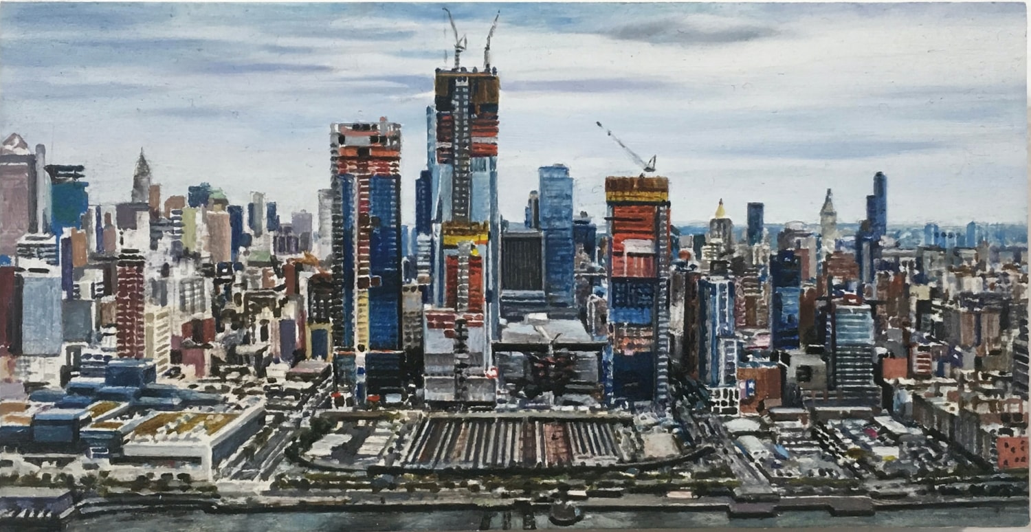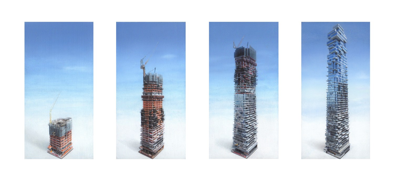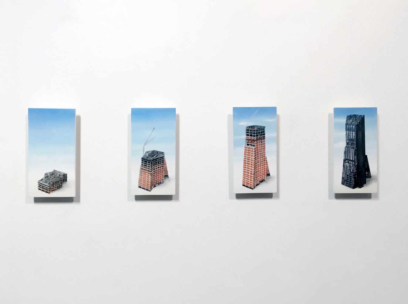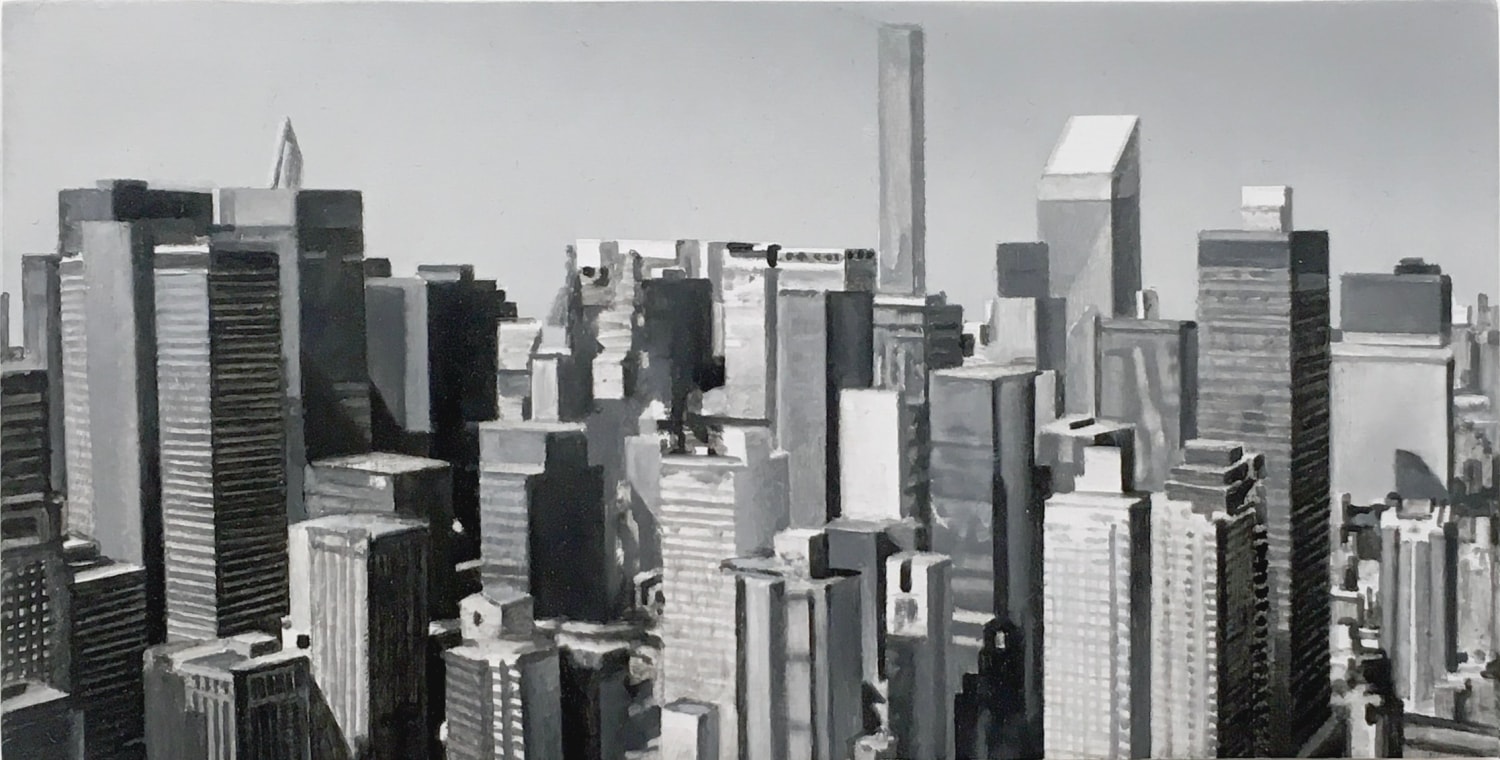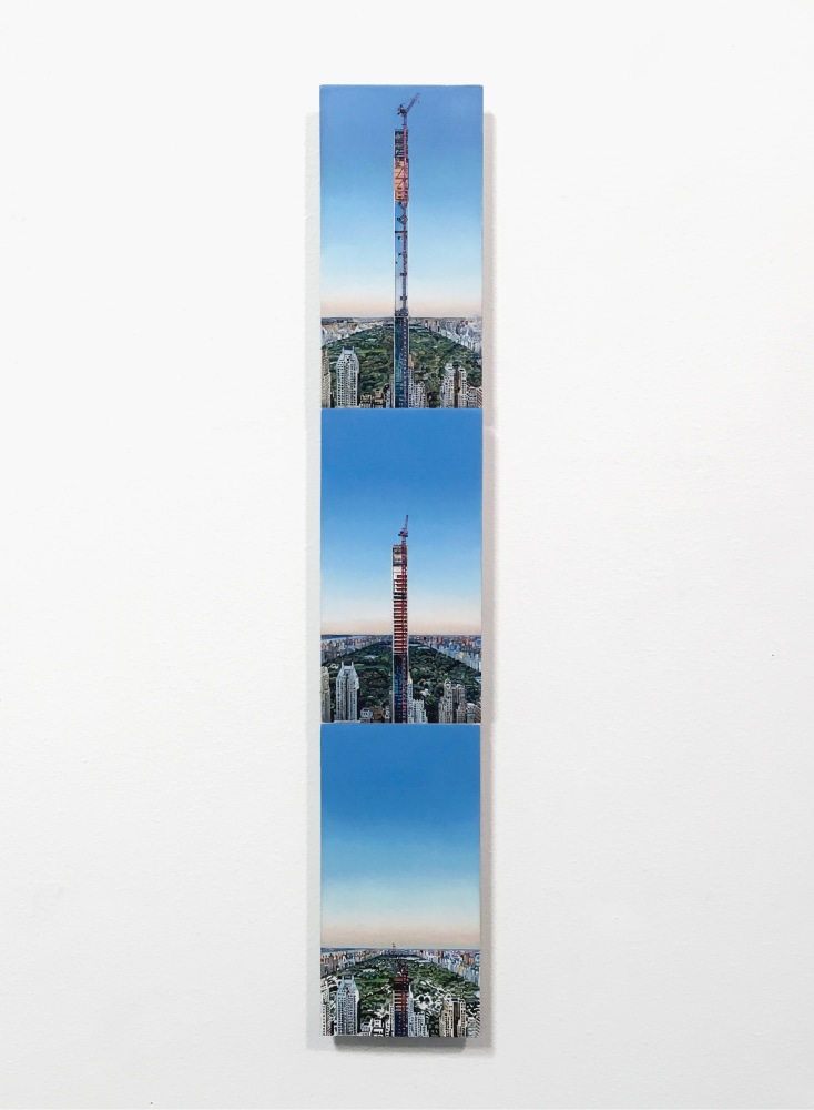 With Vanishing New York, a series of oil paintings on Polaroid photographs and wooden panels the artist offers a counterpoint -intimate in scale and process- to the massive black and white drawings. During the year preceding lockdown, taking long walks around the city with his smartphone, Cormand has been documenting some of the dramatic changes to New York City skyline. In the past decade, the city has known an unprecedented construction boom, generating a sense of dislocation and unreality abruptly interrupted by the Covid 19 pandemic.