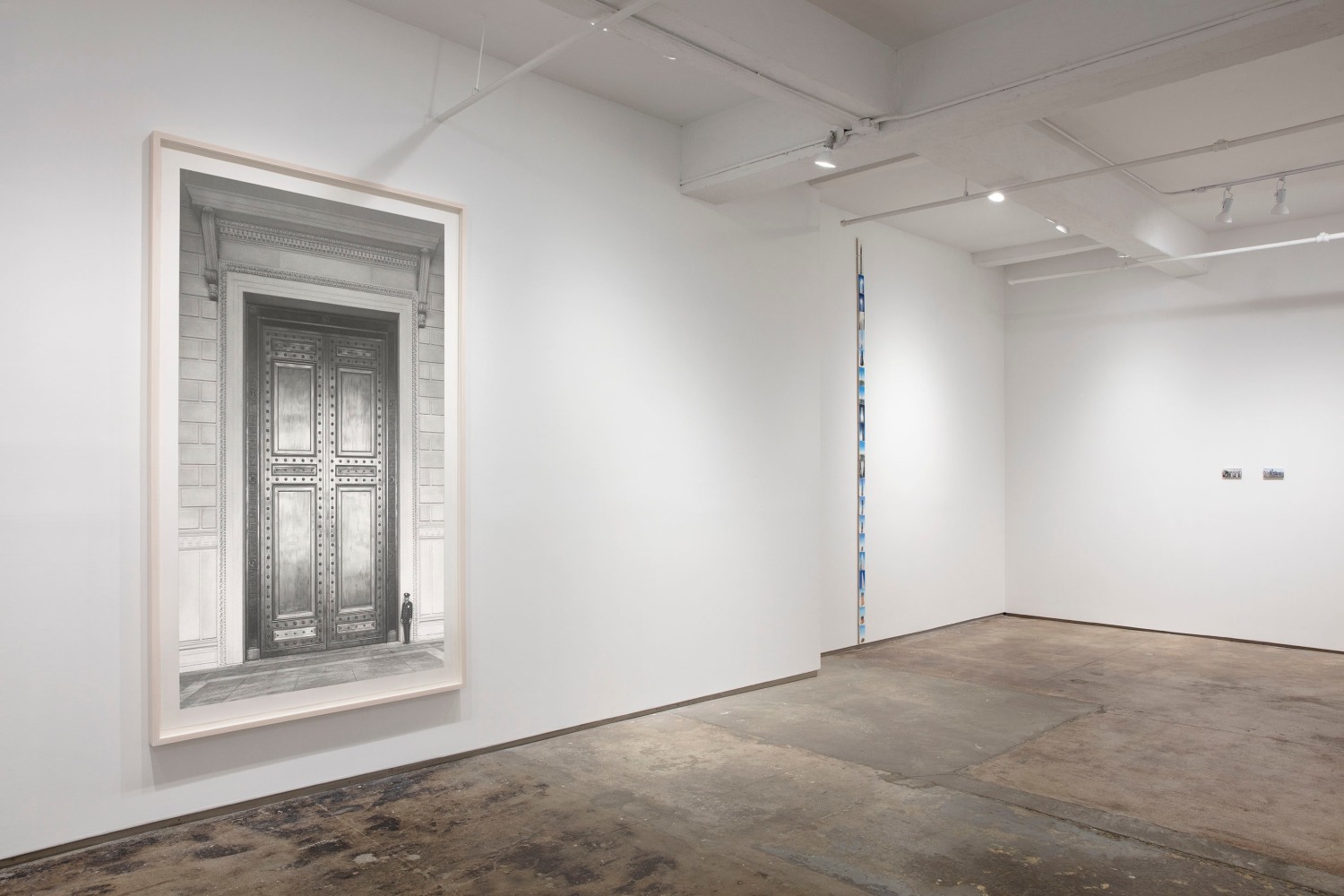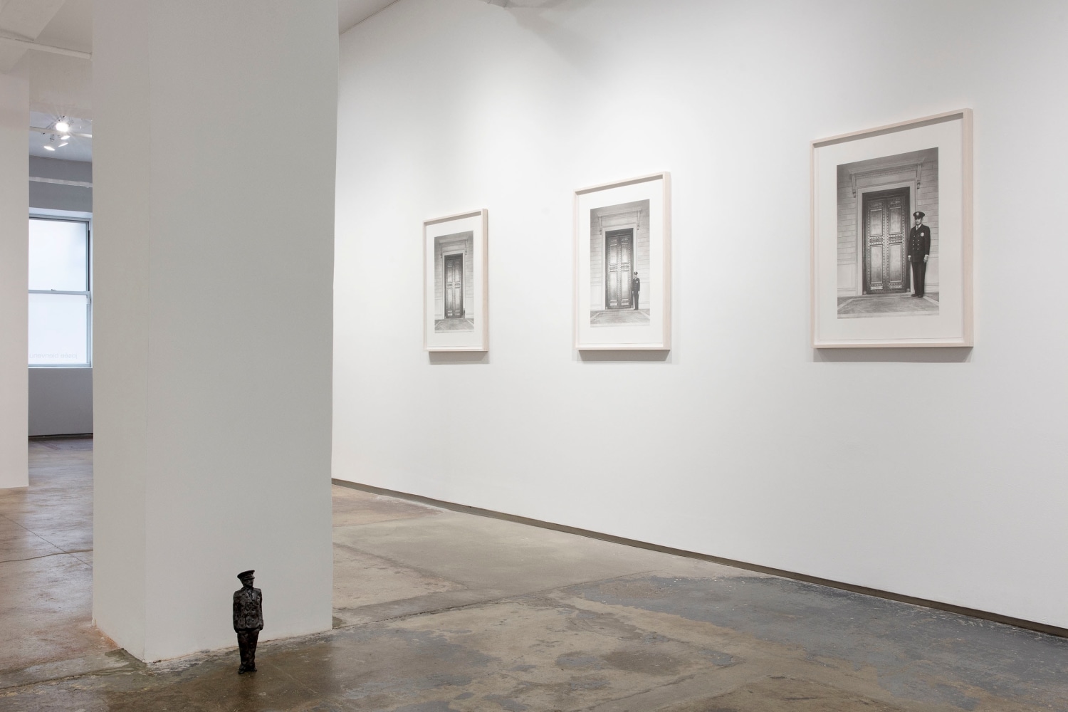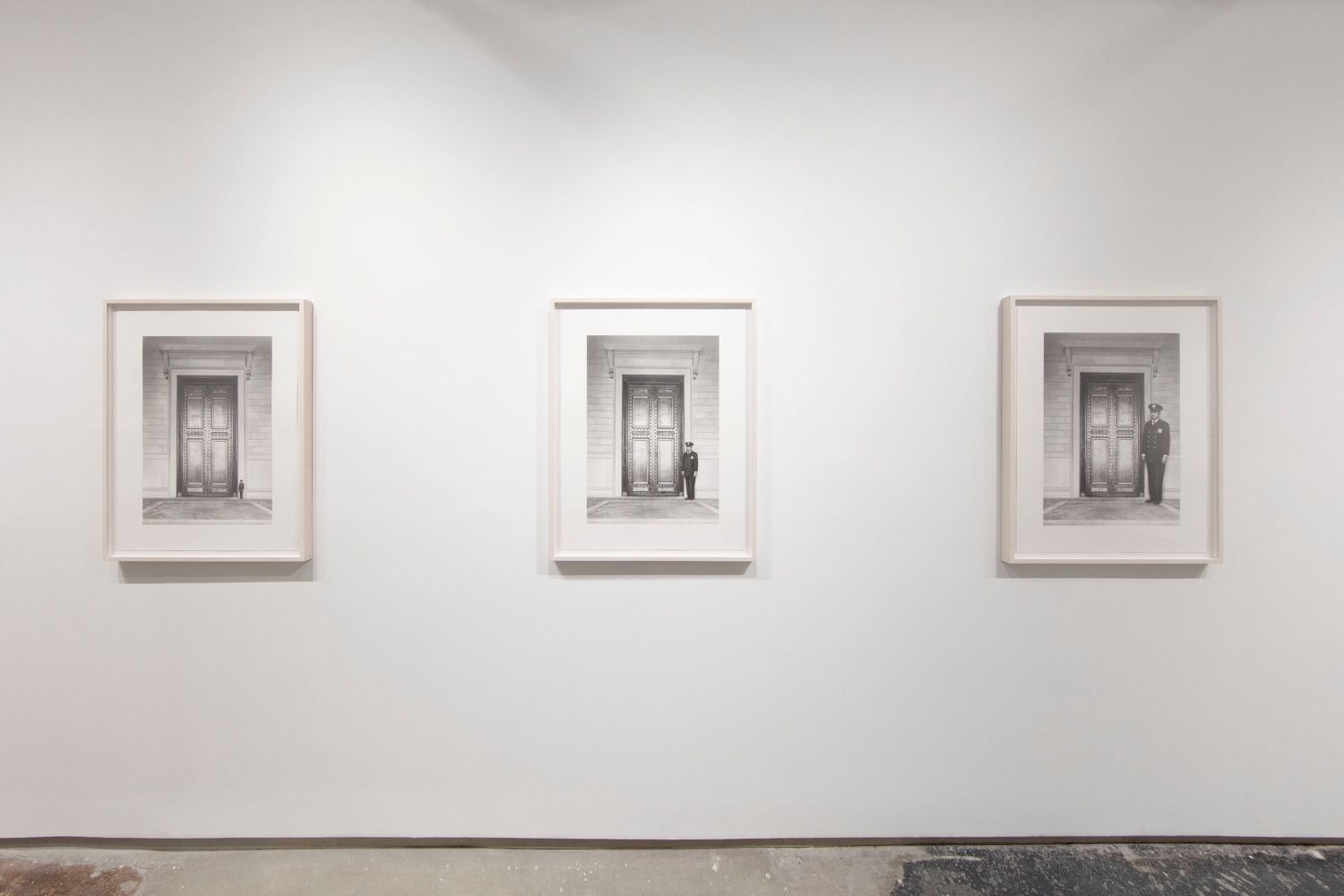 "Invited to participate in an exhibition about the upcoming US election, I was inspired to visit the National Archives in Washington DC where the US Constitution, the Declaration of Independence and the Bill of Rights are housed. Walking up the grand staircase on Constitution Avenue, I fixated on the buildings monumental bronze doors – 38 feet high and over 6 tons. A 1936 photograph of the door showing the relationship in scale between the guard and the door is the subject of my recent work ‘They Might Be Giants’. The title is a reference to Cervantes’ Don Quixote, who believes that the windmills in the distance are ‘hulking giants’ and mistakes their blades for ‘long arms’. Feeling threatened by his delusion, he declares his intention to kill them.”