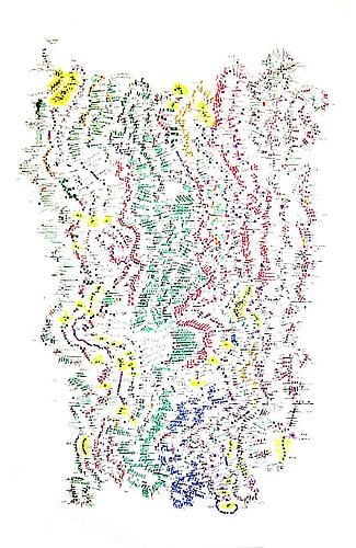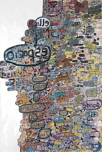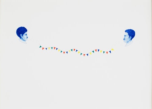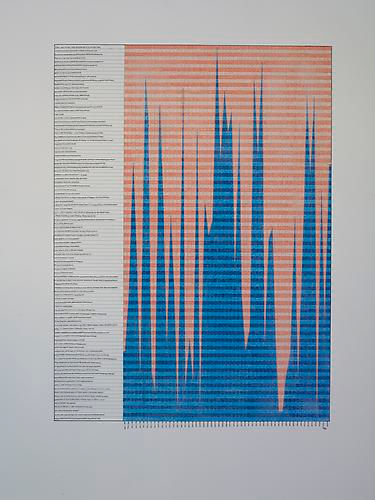 The works in the exhibition touch upon the very fragile nature of communication and exchange. Allyson Strafella’s typewritten drawings on transfer paper, Alexandra Grant’s multilayered wordscapes or Rivane Neuenschwander’s Ze Carioca altered comic books, explore ways of recording, fragmenting and obliterating information to create new non-verbal narratives. Data manipulation is also at the core of Brian Lund’s graphic translations of film sequences and of Jesse Pasca’s charted drawings: Moore’s Law, My Heart as a Stock Market and How To Be Human, map the correlation between human activity and systems of scientific data.