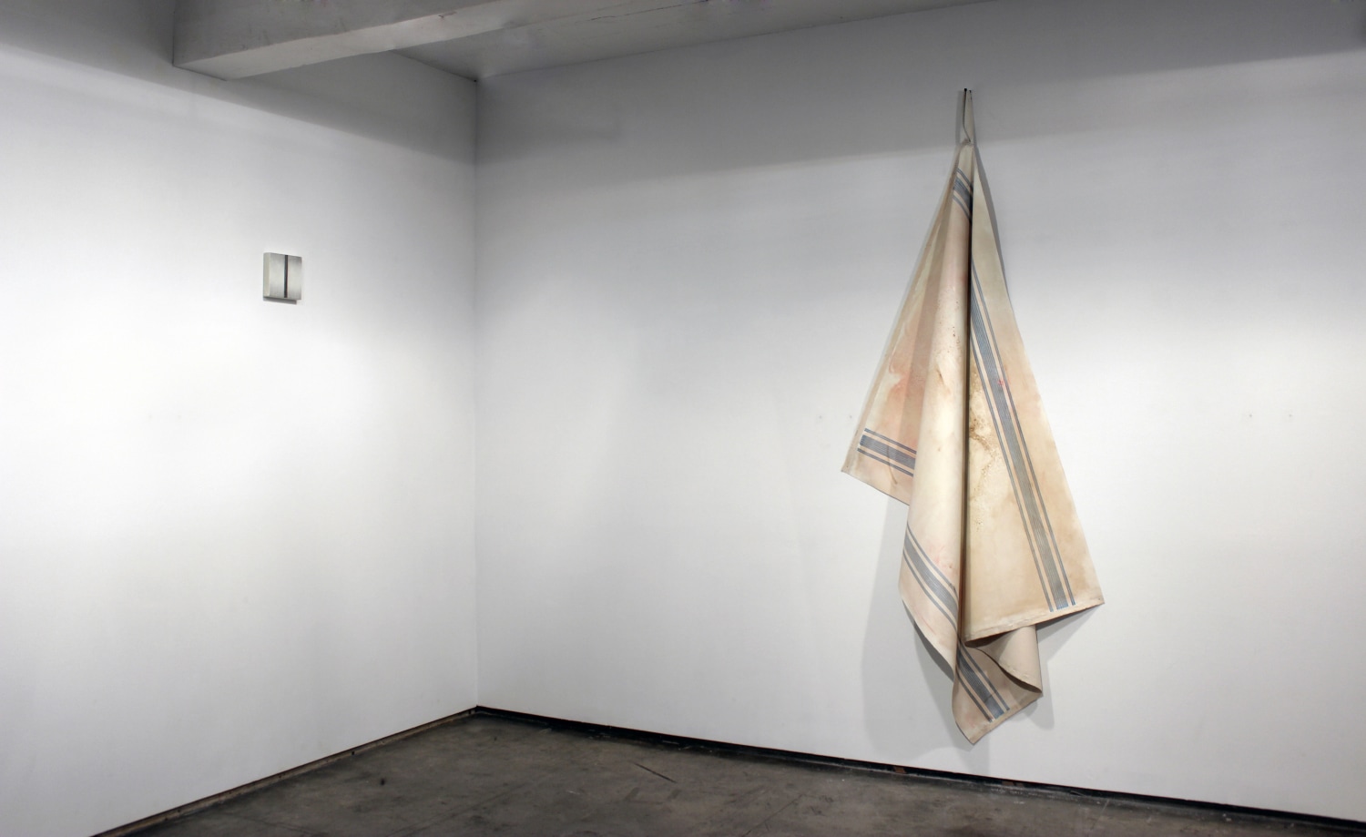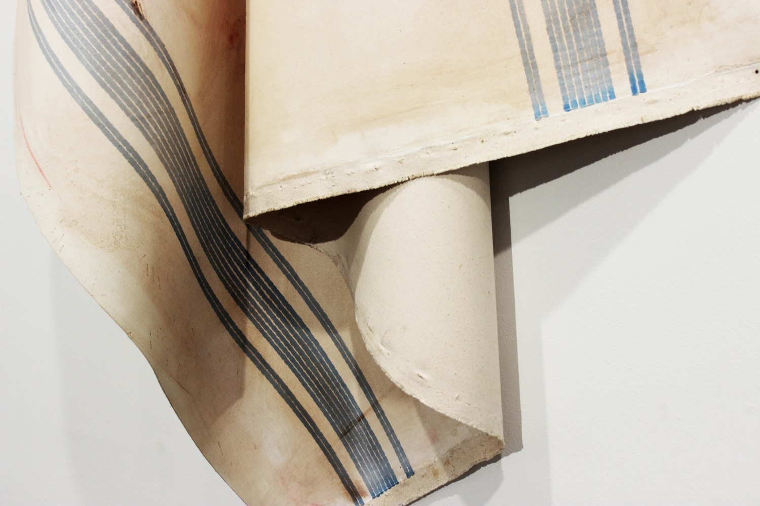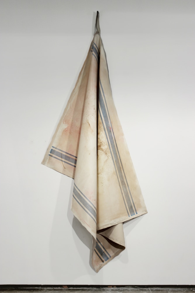 Elena del Rivero's Letter from Home in Cerulean is a monument to domesticity and its monstrosity. It is a giant canvas hanging from one nail in the corner, just like a dishcloth in a kitchen. The process starts with the traditional blue pattern of a European dishcloth made with stitch-like brushstrokes, followed by staining and altering the surface with dirt from the studio floor, coffee from the breakfast table, or leftover paint smudged on the surface. Like in most of del Rivero's work, delicacy and a sense of loving attention coexist with a feeling of neglect and abandonment.