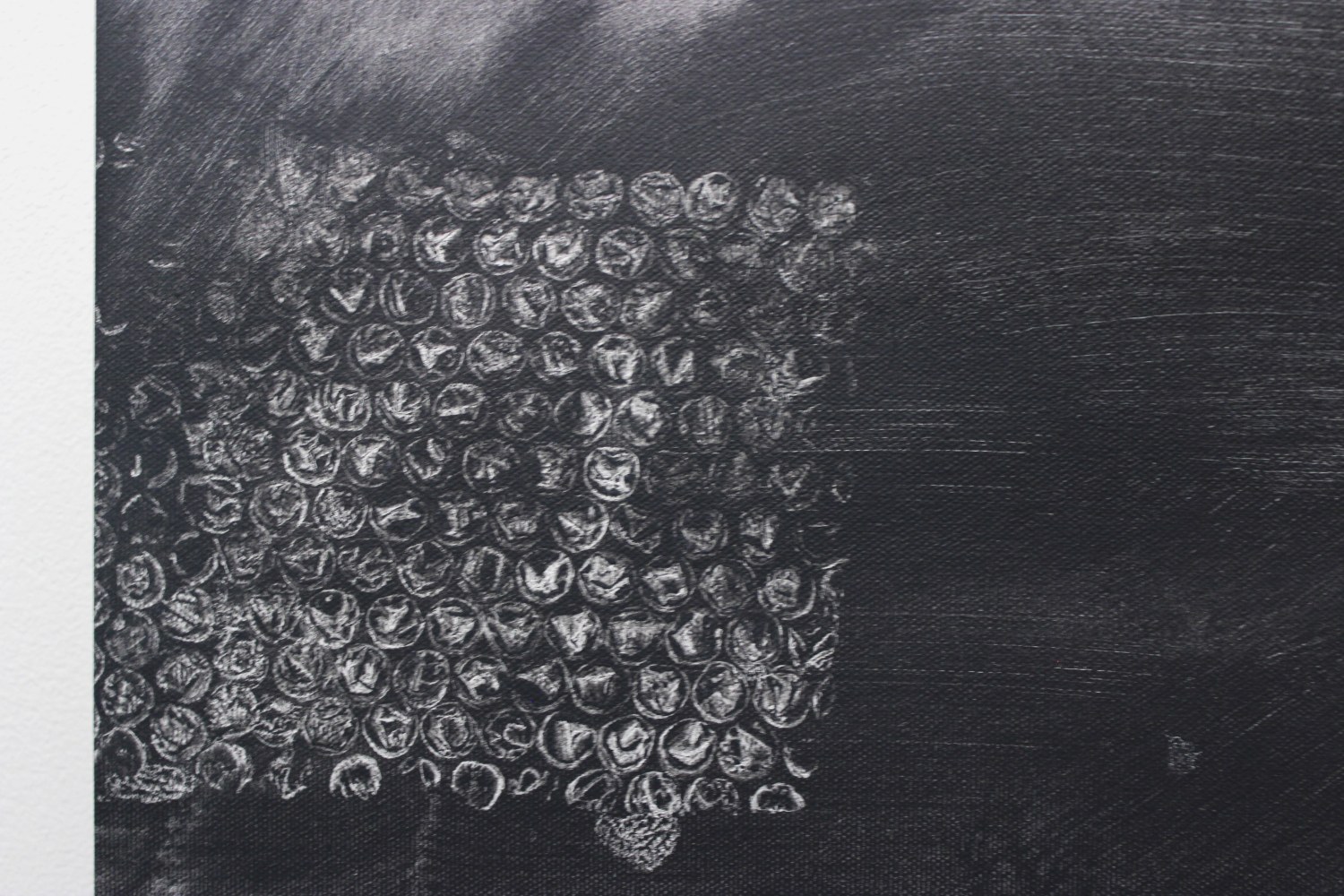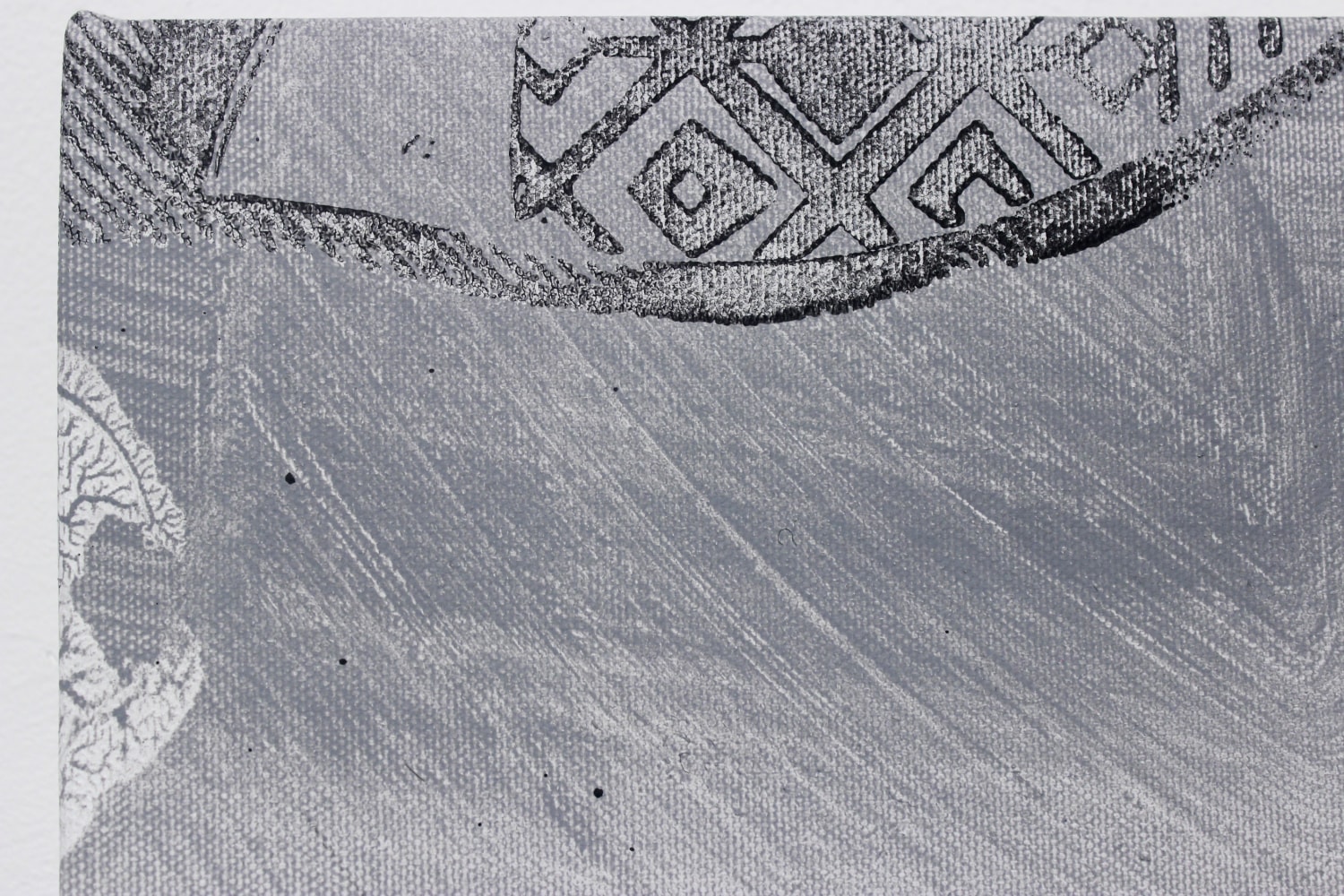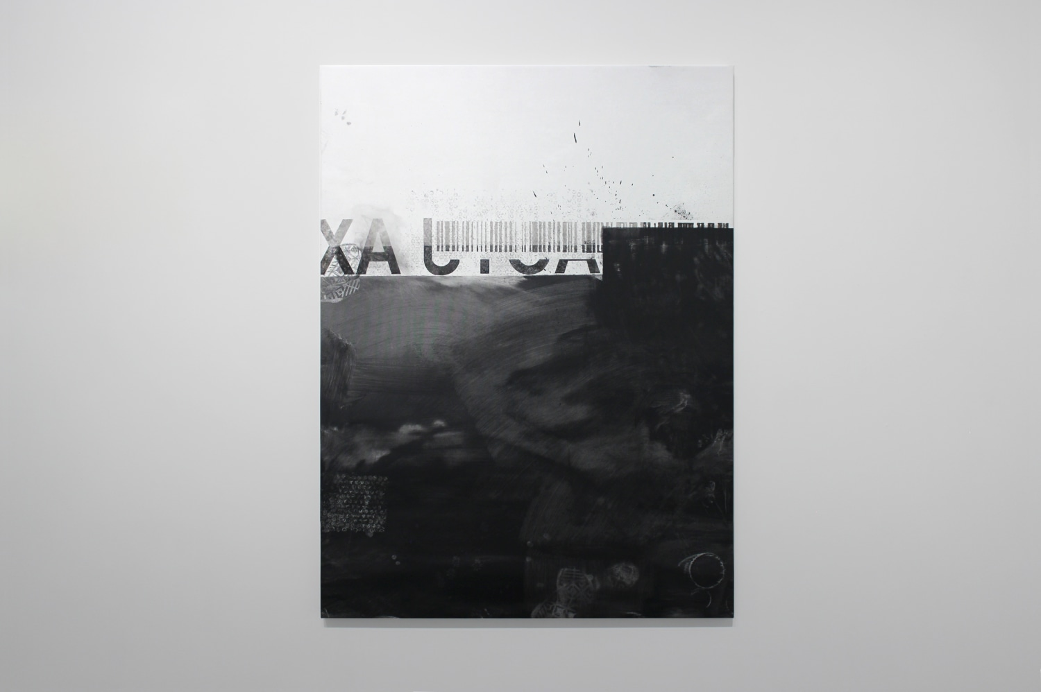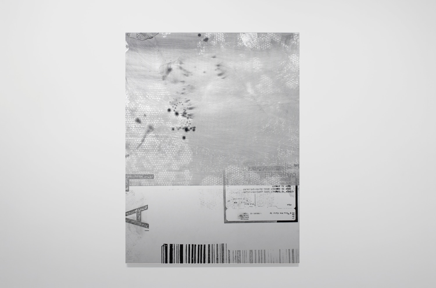 In Pasaportes, Mexico based conceptual artist Ana Bidart examines access and identity. The paintings are a record of her last two years working as an artist's assistant, her time spent packing and labeling the works of other artists. Incorporating the vocabulary of tracking numbers and of various discarded materials, the paintings allude to various techniques of mechanical reproduction to explore traces left of relationships. Silkscreening, xeroxing, and photoshopping are done here in a low-tech, low-key way, by directly applying objects to the canvas (bubble wrap, footprints) and rubbing the surface with solvents in large areas of grayish brushstrokes.