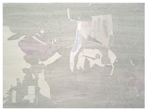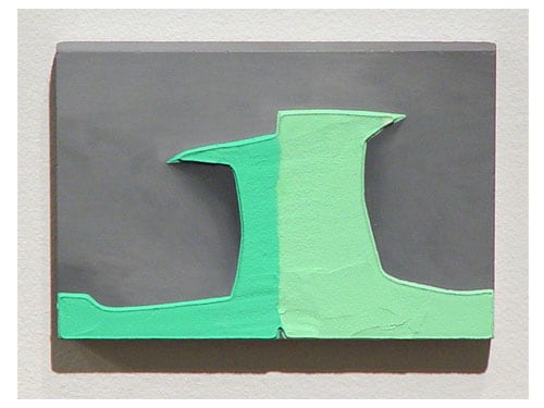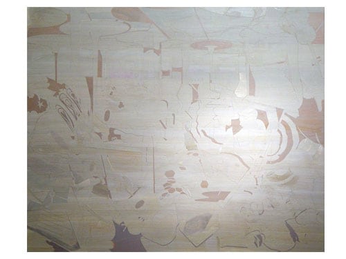 Aaron Wexler is interested in the fine line between desire and fear, fragility and stability. His cut-paper paintings juxtapose faintly outlined images: a jumping basketball player, a giant butterfly, a floating fragment of Wright’s Guggenheim Museum… The Ghostly mat acrylic surfaces of the paintings are gently incised and peeled away to reveal playful dreamscapes of free association.