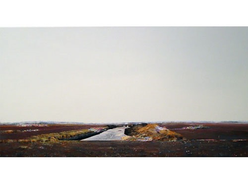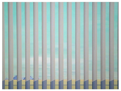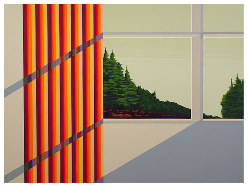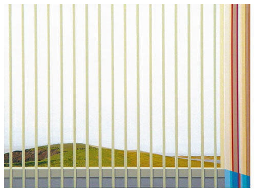 Erica Baclawski’s paintings explore the psychological space between landscape and the body. While indulging in the conventions of the romantic legacy of landscape imagery, her paintings draw attention to its artifice. The view is always experienced through a window; architecture is the omnipresent frame of the panorama. A cool unreal lighting amplifies a sense of disenchantment and removed sentimentality.