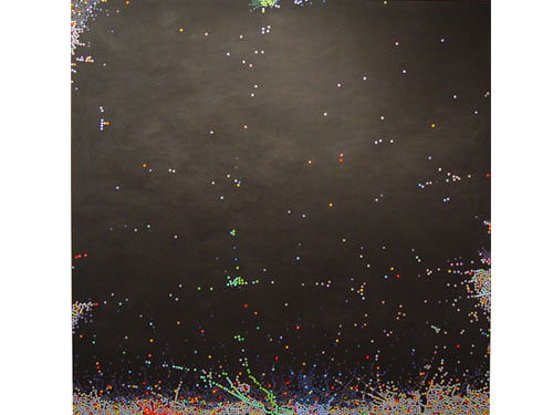 Mark Ferguson’s retinal confections stage a toxic game. His paintings offer a concentration of information without the possibility to access it. They consist of dark backgrounds invaded by bright colored dots. In this new group, clusters of dots infiltrate the whole territory of the painting like color-coded information gone dysfunctional. The work offers an explosion of possible alternatives: a world where neither emptiness nor saturation dominates, where space and time are reconsidered for a new vocabulary to emerge.