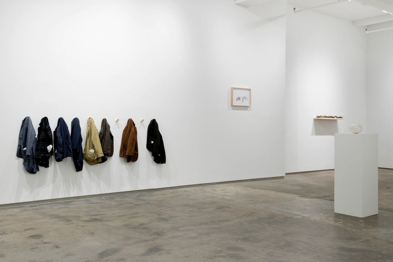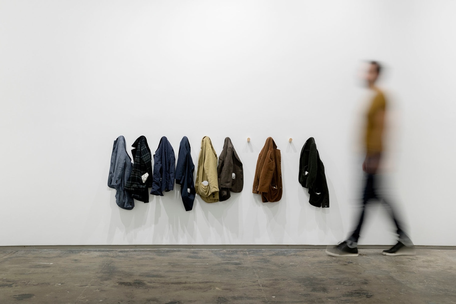 Eight small jackets (the size worn by first grade elementary school students) are hung low on pegs, their pockets groaning under the weight of the hefty poetry-wrapped stones that they accommodate. Often displaying a reckless courage, children from Catholic ghettos grew up throwing stones at police vans and army vehicles, taunting soldiers as they hauled off fathers and brothers in dawn raids. The text of a single “troubles” poem is divided between the two stones, one for each pocket, ready to be thrown. The words of the poems gain literal weight and even the anticipation of action and violence from their supports.