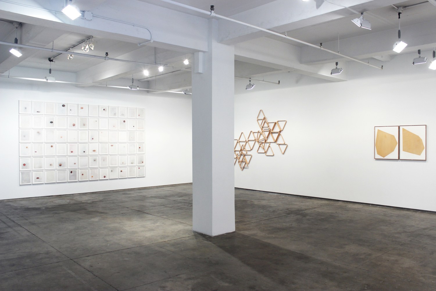 Dario Escobar is renowned for his sculptural re-contextualization of everyday objects. His work explores concepts of cultural and historical hybridity ultimately attempting to reexamine Western art history from a Guatemalan perspective. Reticula, part of Dario Escobar's "ultramoderno" project commenting on the failed utopia of modernism in Central America, 50 pool triangles made in Taiwan becomes a relief, and its composition follows a modern grid. Escobar’s work, characterized by the use of materials charged with historical and symbolic meaning, is articulated in a minimalist language like in Yellow Composition, a linseed oil drawing, and the wall sculpture.