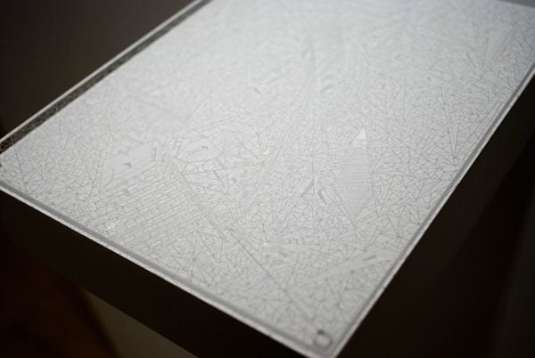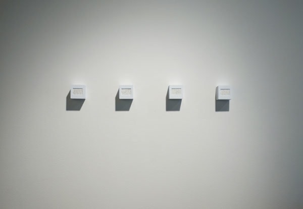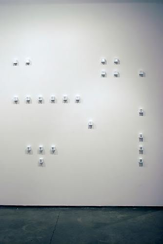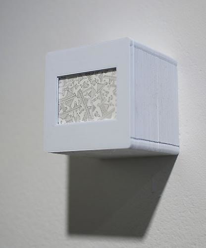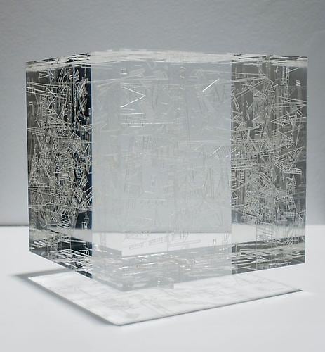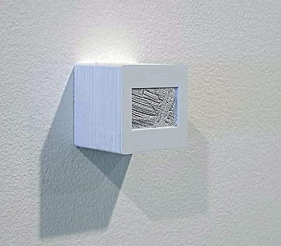 Both Jacob El Hanani and Renato Orara bring drawing to an extreme, as a sort of "maximalism." For the exhibition, they produced a drawing in collaboration. In his latest experiments, Marco Maggi pushes drawing to another dimension: the line is freed from the single plane and travels onto the six faces of Plexiglas cubes. The intricate webs etched on the Plexiglas surfaces cast sharp shadows onto their underlying platforms: drawings that don't exist. Braille Wall is an installation ofmicro-drawings in stacks of slide mounts. The slide cubes form an illegible alphabet on the wall, reminiscent of Braille text.