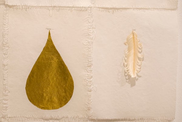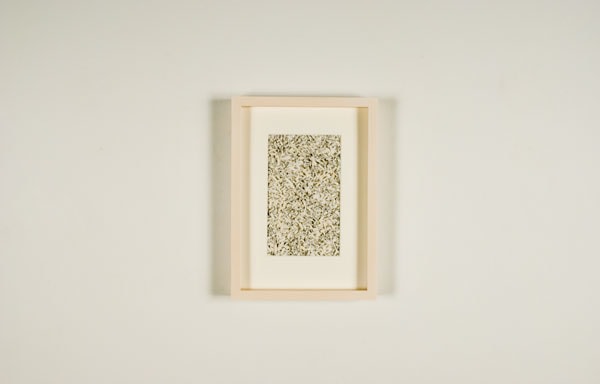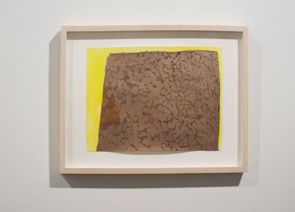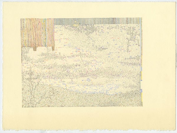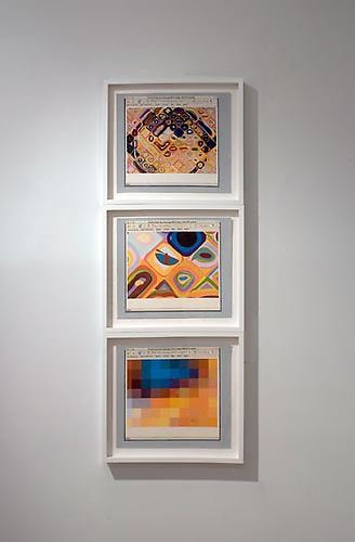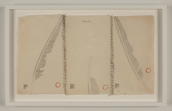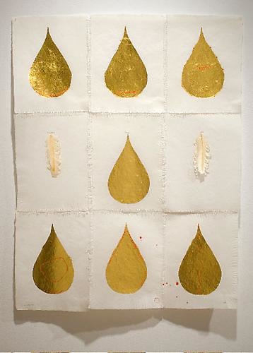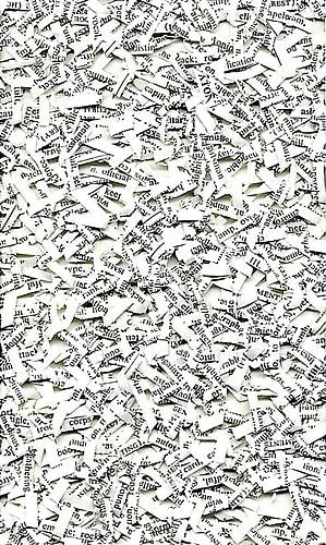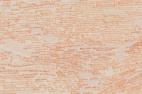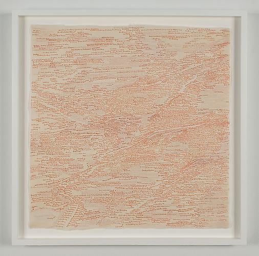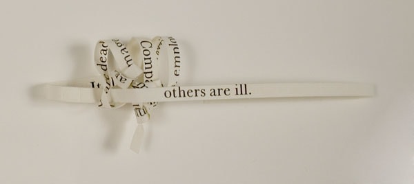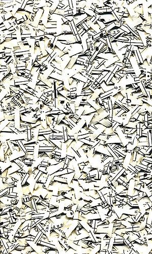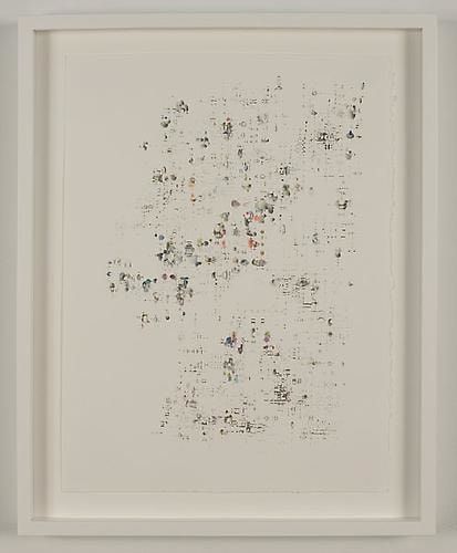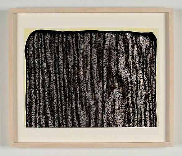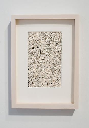 Stefana McClure turns text into image. Deconstructed texts, including news/novels in three lines by Felix Feneon and excerpts from the New Thesaurus in Dictionary Form are reconfigured as continuous lengths of string and knitted. Annabel Daou also examines text and language, employing modes of translation and transliteration in English and Arabic. Her drawings of repeated words simultaneously create and eradicate meaning. Her latest works randomly map everything that happened in 2008, from personal events to world events. Elena del Rivero's recent ongoing projects, AF Klint and The Somosi Series, deal with transformation, with repairing and healing materials as a metaphor for life. In some cases the surface has been gilded with gold leaf, in others the translucency of the abaca paper is visible through the marks and stitches that barely hold the works together. Daniel Robert Hunziker's inlays are constructed from book jackets combining colors that refer to the decades in which they were published. His collages allude to Swiss constructivism and to the Duchampian tradition with their "almost ready-made" qualities, still showing traces of use with parts of the jacket text shimmering through the paper.