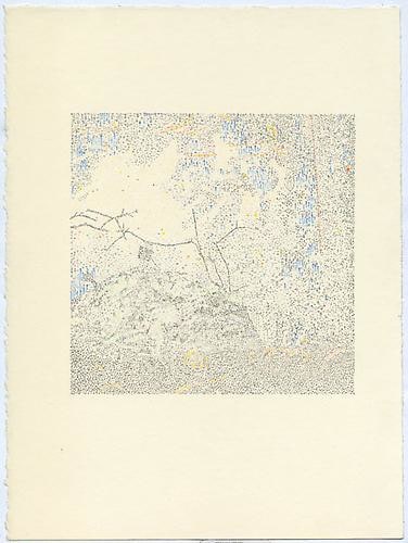 Robert Jack and Eduardo Santiere's works are silent processes, osmotic and homeopathic developments governed by the imperceptible. Every surface hides a symbiotic network, whether it is scratched with a needle as in Santiere's bio-construction landscapes, or marked with metallic ink as in Robert Jack's new drawings. In Alex Kvares' colored pencil drawings, the small, stitch-like marks simulate embroidery. Images are fractured to expose the formal spectacle of underlying abstraction.