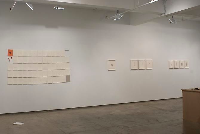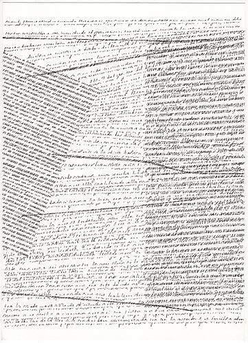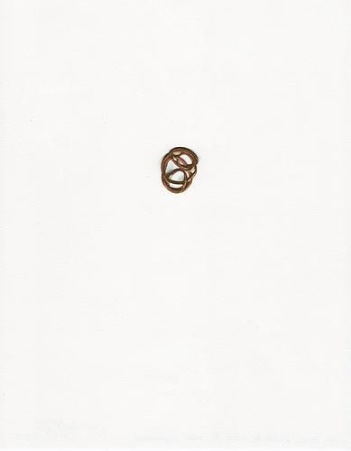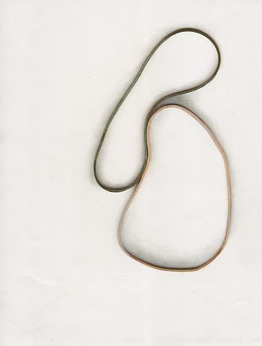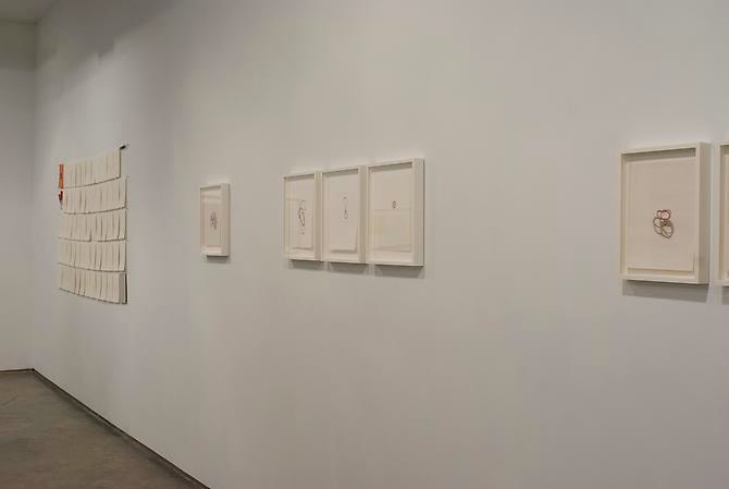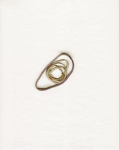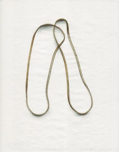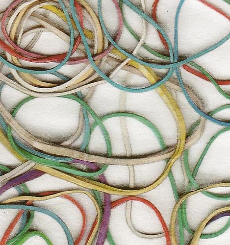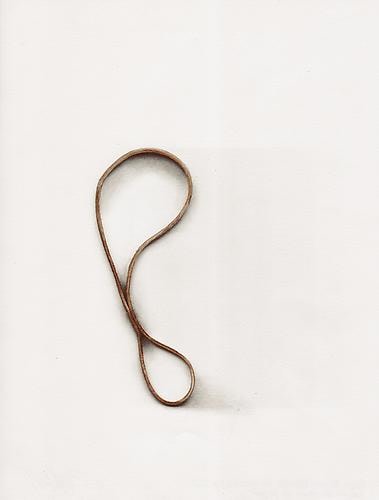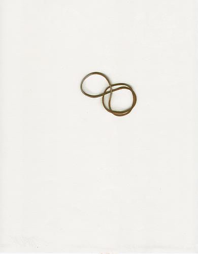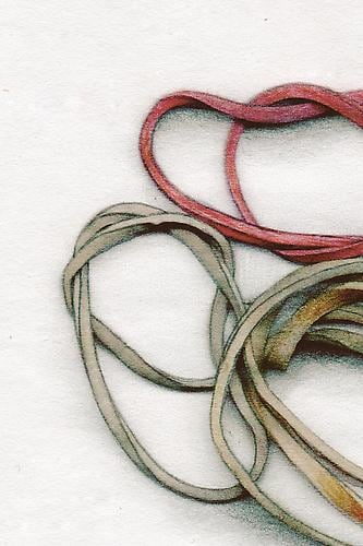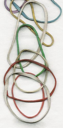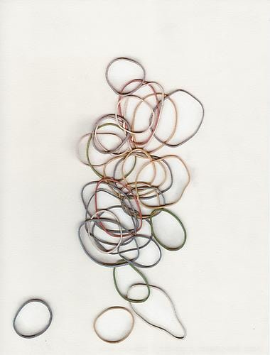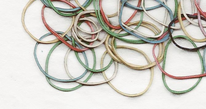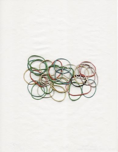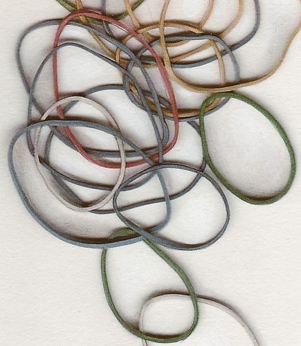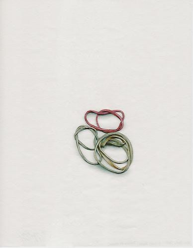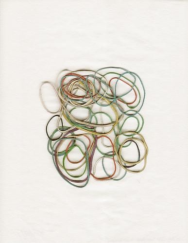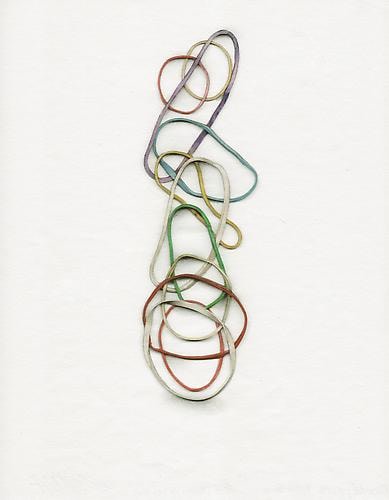 Bernardo Ortiz visualizes and registers the passing of time through obsessive subtle markings on a page; he often attempts to evoke an anachronic quality in his drawings by affecting his material support. Endless, light graphite lines and circles made with thin coats of gouache serve as reminders of quotidian occurrences. Johanna Calle’s illegible and indecipherable handwritten letters are intimate testimonies of past, unresolved incidents that hinder the present. A tree silhouette made of transcribed text on an employee time card template, references the urgent conservation of tropical ecosystems while opposing complex models of time. Gloria Ortiz-Hernández’s evocation of time is one that implies the concept of change through hyperrealist depictions of rubber bands that accumulate progressively.