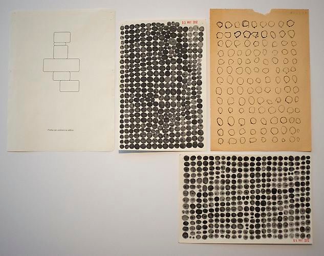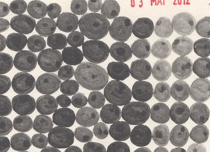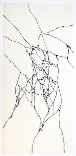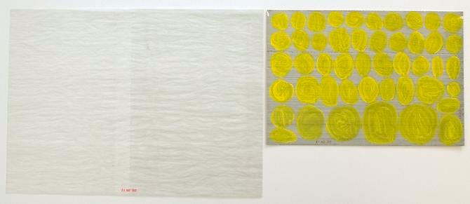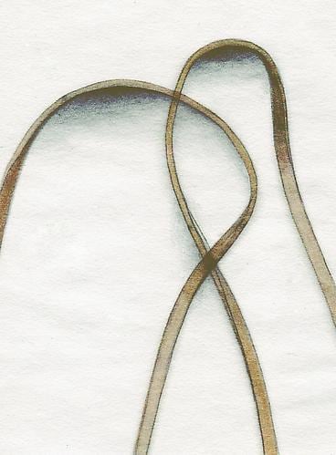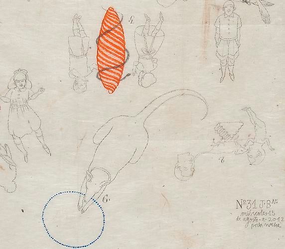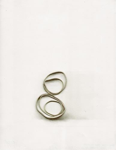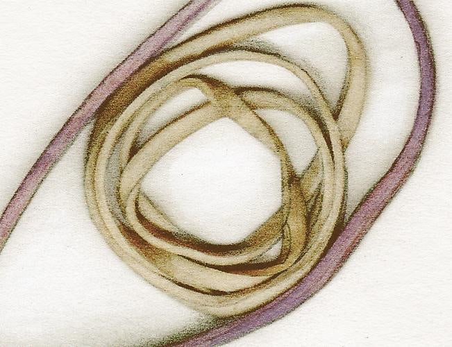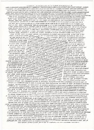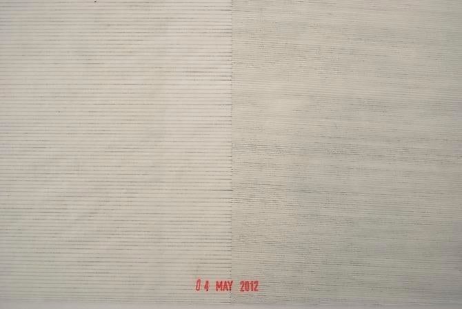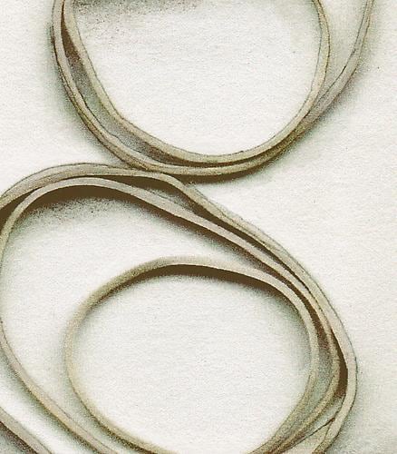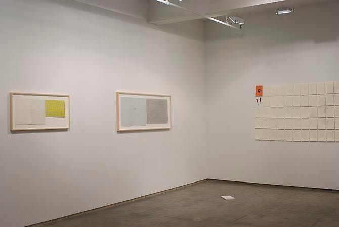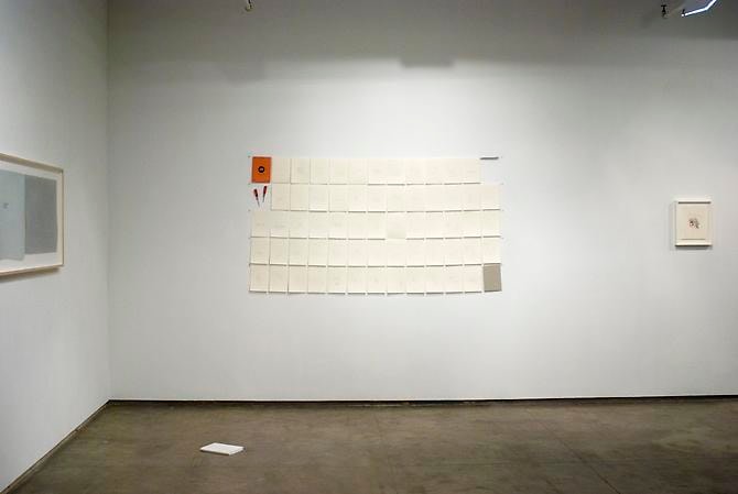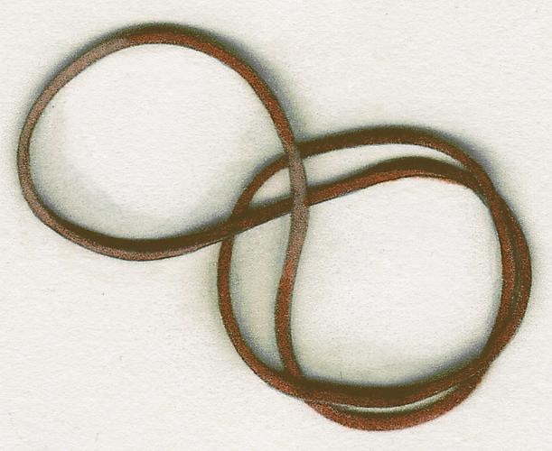 Bernardo Ortiz visualizes and registers the passing of time through obsessive subtle markings on a page; he often attempts to evoke an anachronic quality in his drawings by affecting his material support. Endless, light graphite lines and circles made with thin coats of gouache serve as reminders of quotidian occurrences. Johanna Calle’s illegible and indecipherable handwritten letters are intimate testimonies of past, unresolved incidents that hinder the present. A tree silhouette made of transcribed text on an employee time card template, references the urgent conservation of tropical ecosystems while opposing complex models of time. Gloria Ortiz-Hernández’s evocation of time is one that implies the concept of change through hyperrealist depictions of rubber bands that accumulate progressively.