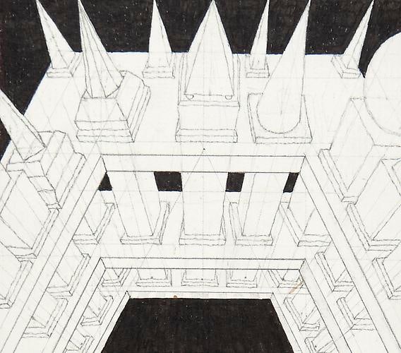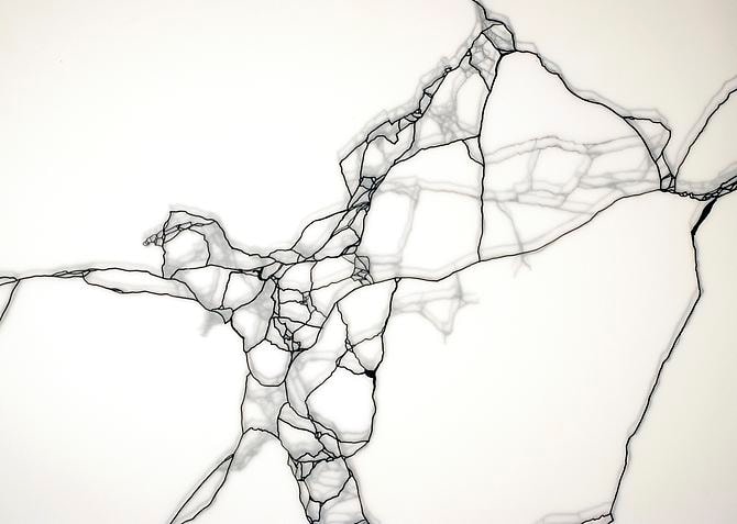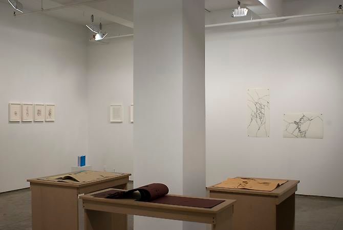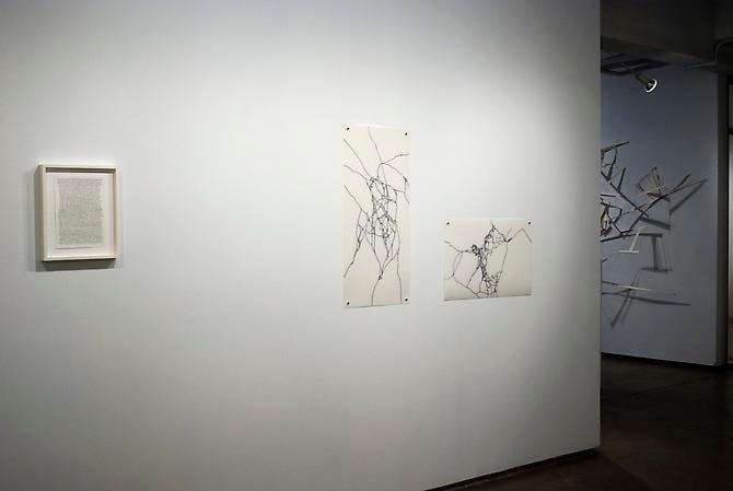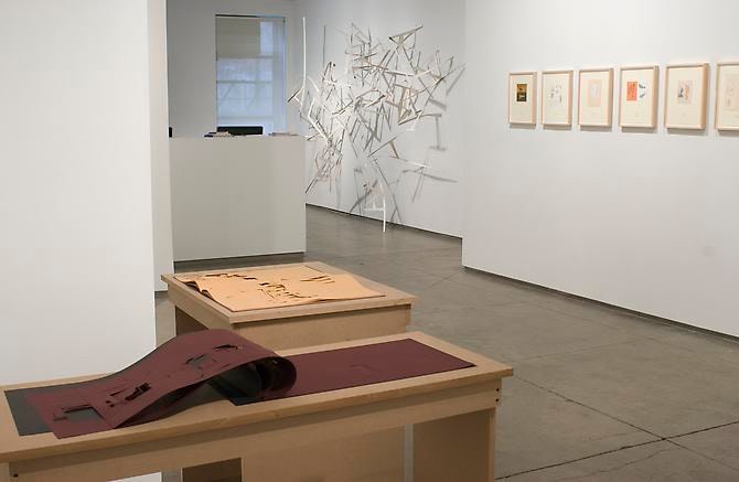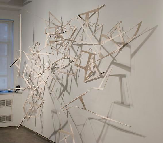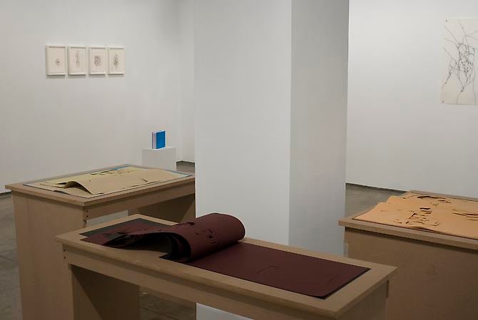 A conceptual approach to drawing that formally transgresses a two-dimensional flat surface leads Mateo López to explore the realm of three-dimensionality through a series of sculptural pieces that while attesting to the importance of books in Lopez’s practice, they reference the artist’s meaningful involvement with notebooks, sketchbooks, and books over time. Maria Fernanda Plata’s longstanding interest in the concept of time with relation to architecture, gives way to the creation of delicate cutout notebooks representing building facades that bring into play the notions of construction, destruction, presence and absence. Luis Roldán’s large-scale explosion of paper, graphite and wooden beams projecting into the gallery space, speaks of deconstructed kites and fractured memories.