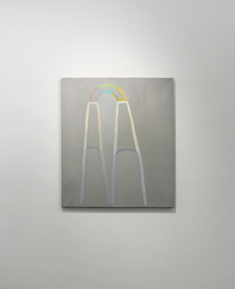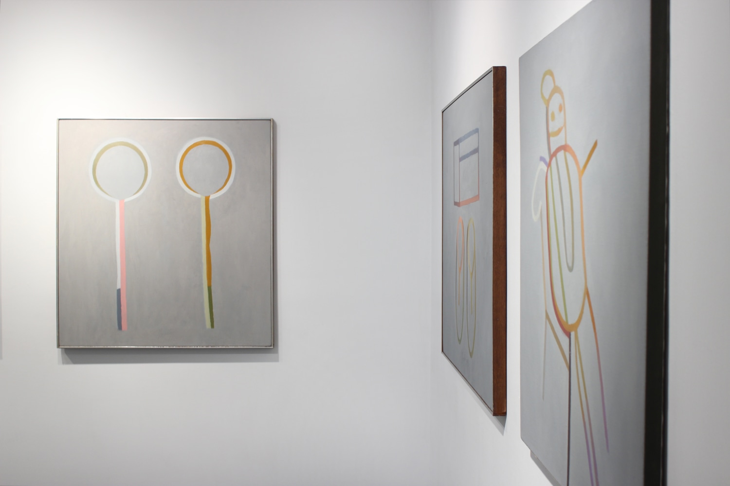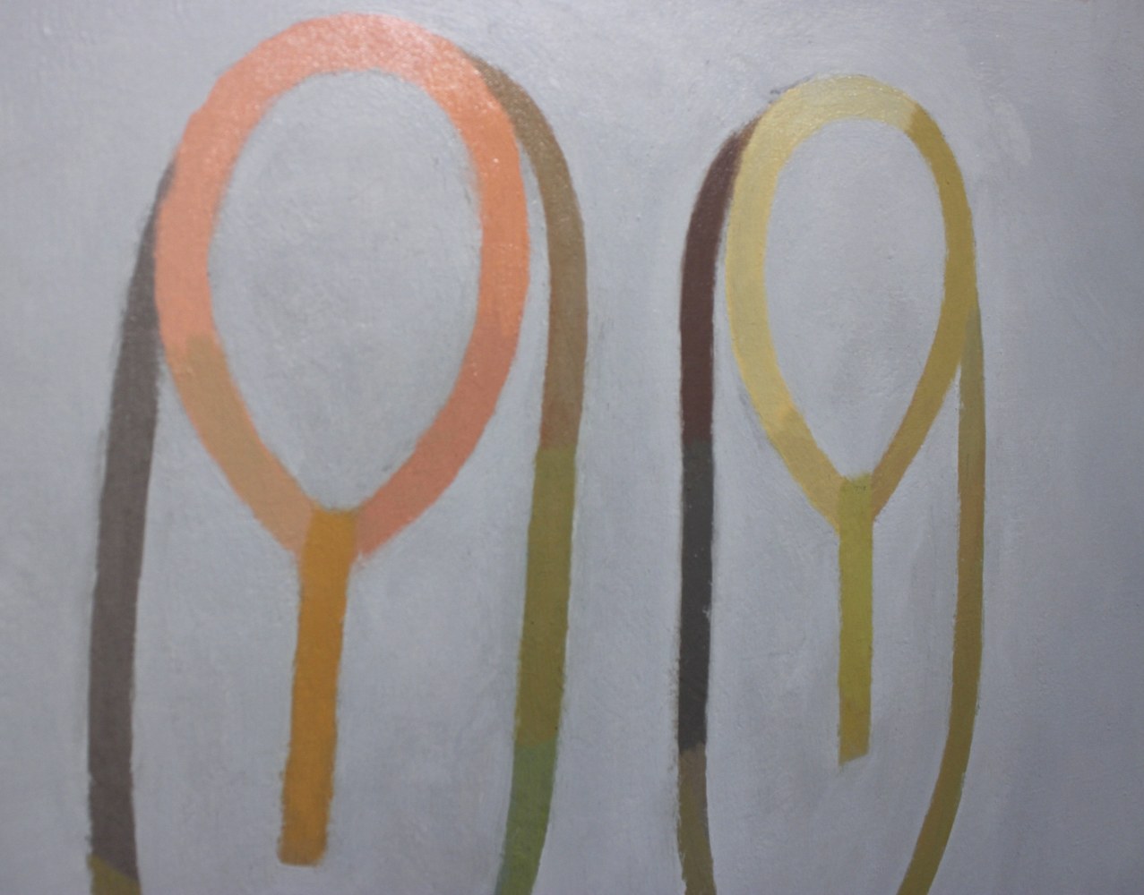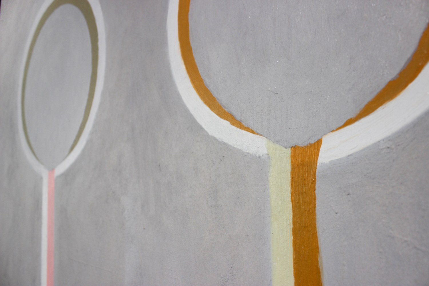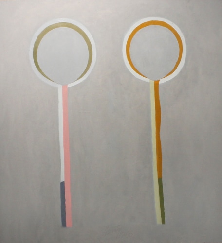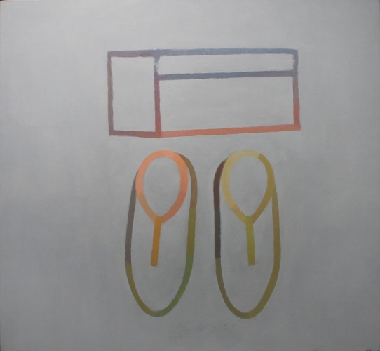 John Thornton’s reductive paintings from the 1960’s are rich with ambiguities of space and color. Thornton explains these works as searching for the meaning of line as an edge or a direction that attempts to describe a spatial event. These paintings are his intuitive exercises in which lines paradoxically “undefine space” through his exquisitely lean color palette and simplified forms. Against neutral colored backgrounds, Thornton has painted the elemental outlines of archetypal domestic shapes: shoes, trees, towers, and others suggesting forms that demand space for their presence. By the use of subtle transitions of color within these lines, he flattens the forms to abstractions that become cyphers for themselves. Thus the lines defy or “ruin” space and form so that we must confront his paintings as abstract exercises of great beauty and pleasure.