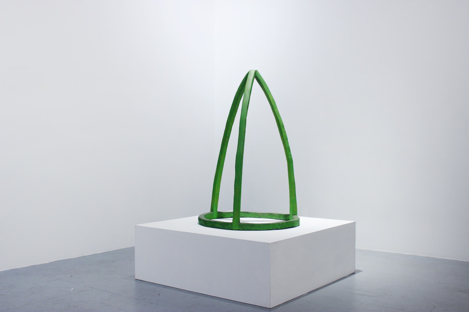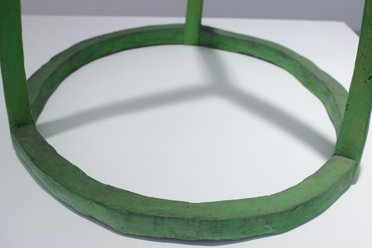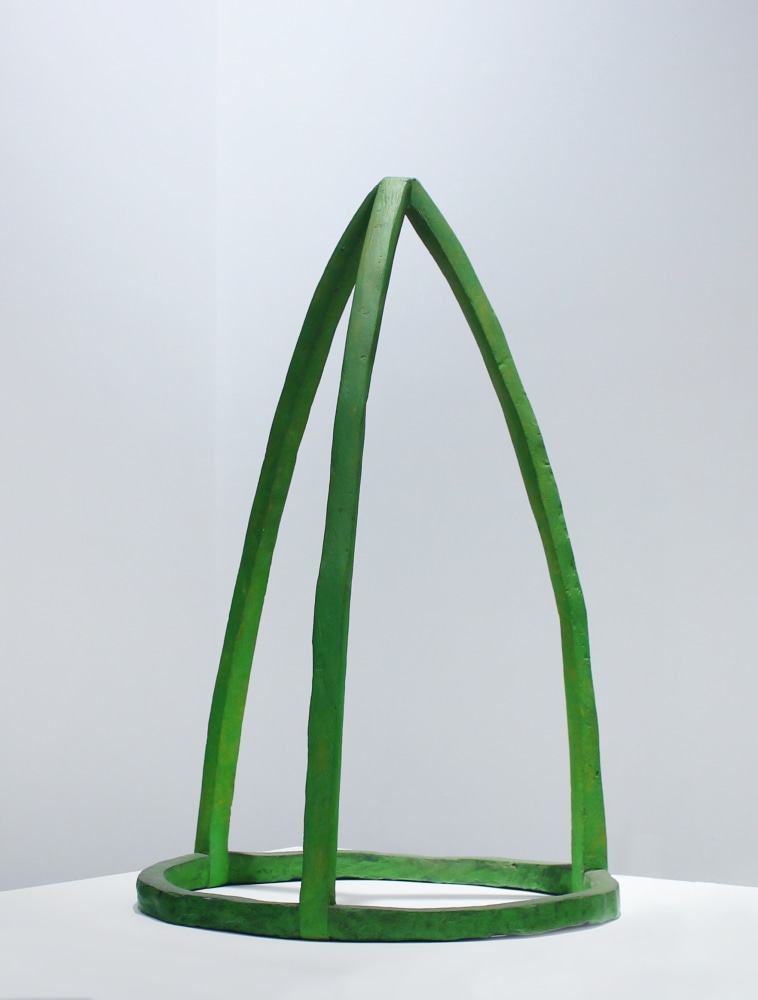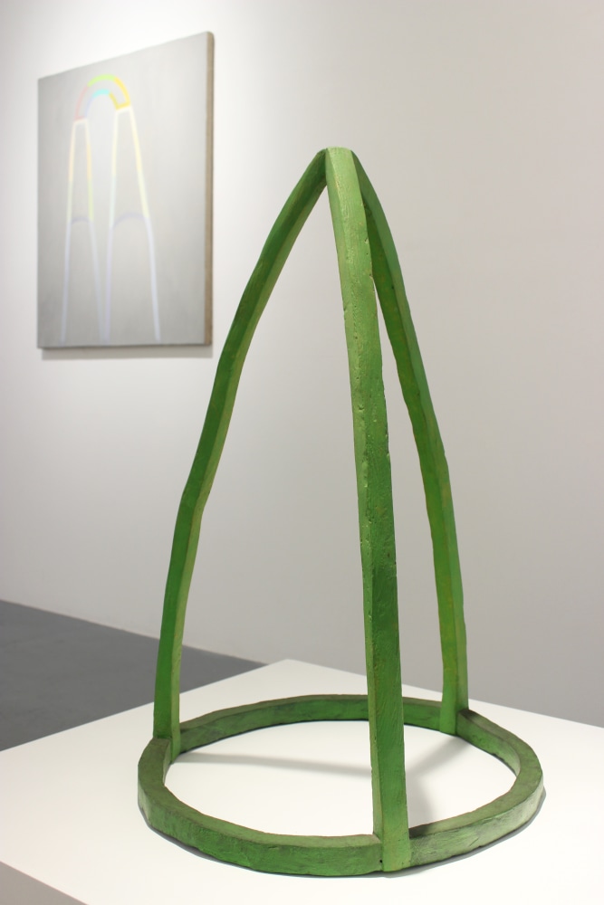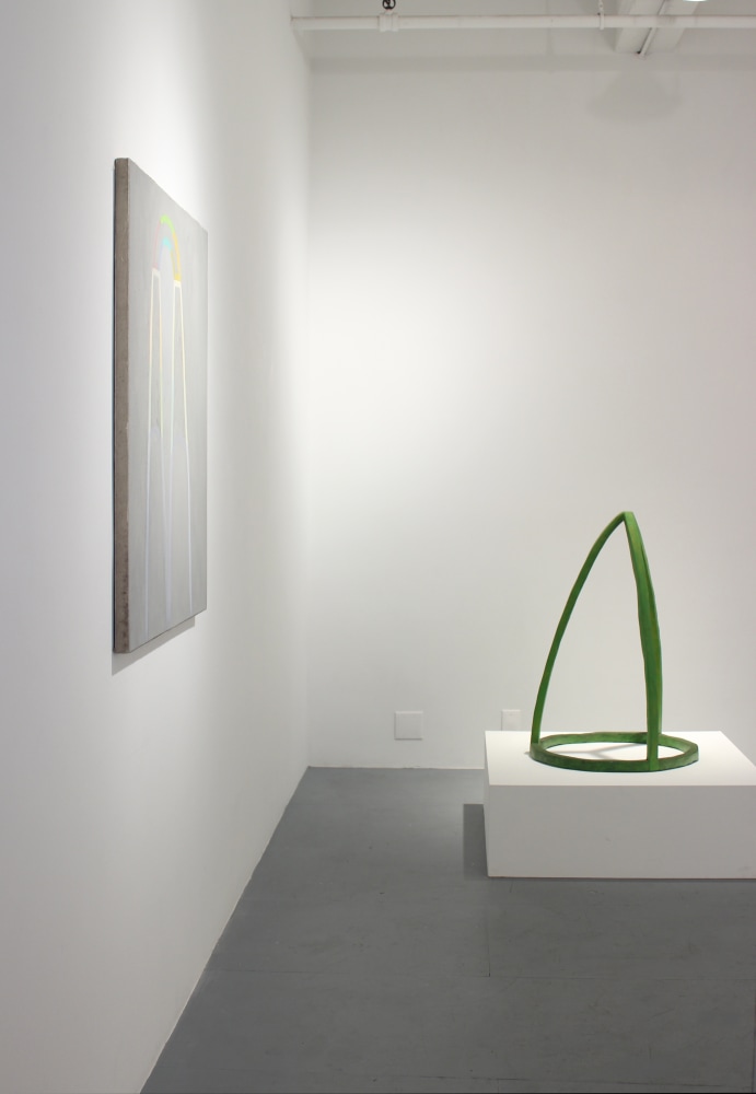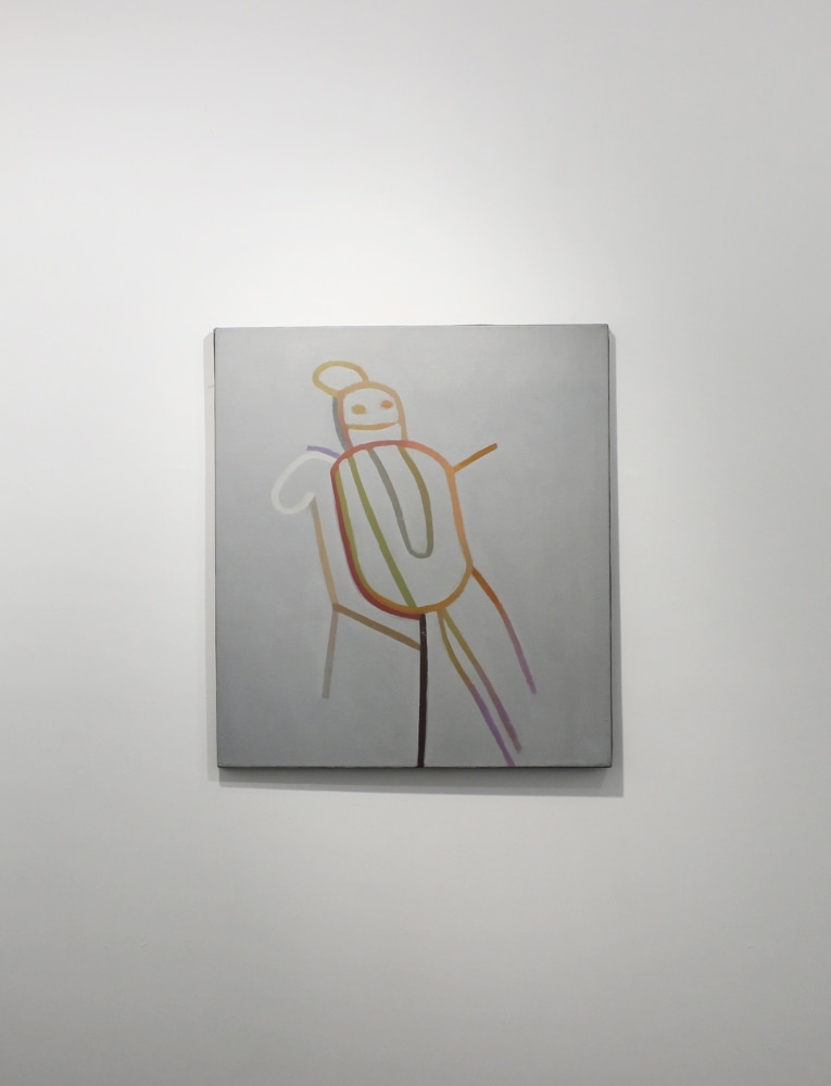 John Thornton’s reductive paintings from the 1960’s are rich with ambiguities of space and color. Thornton explains these works as searching for the meaning of line as an edge or a direction that attempts to describe a spatial event. These paintings are his intuitive exercises in which lines paradoxically “undefine space” through his exquisitely lean color palette and simplified forms. Against neutral colored backgrounds, Thornton has painted the elemental outlines of archetypal domestic shapes: shoes, trees, towers, and others suggesting forms that demand space for their presence. By the use of subtle transitions of color within these lines, he flattens the forms to abstractions that become cyphers for themselves. Thus the lines defy or “ruin” space and form so that we must confront his paintings as abstract exercises of great beauty and pleasure.